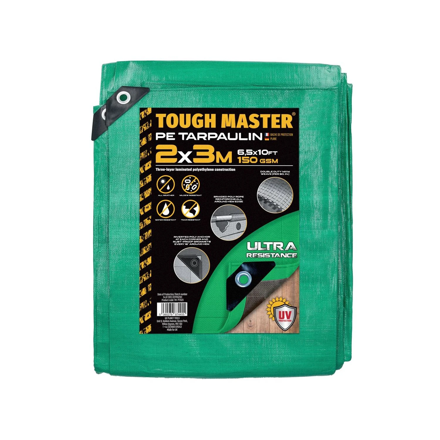 - Durable fabric: This large tarpaulin from TOUGH MASTER® is created from 150 grams of woven polyethylene fabric per square metre that’s a full 14×14 fibre strands per square inch. This water resistant tarpaulin is laminated on each side for extra durability