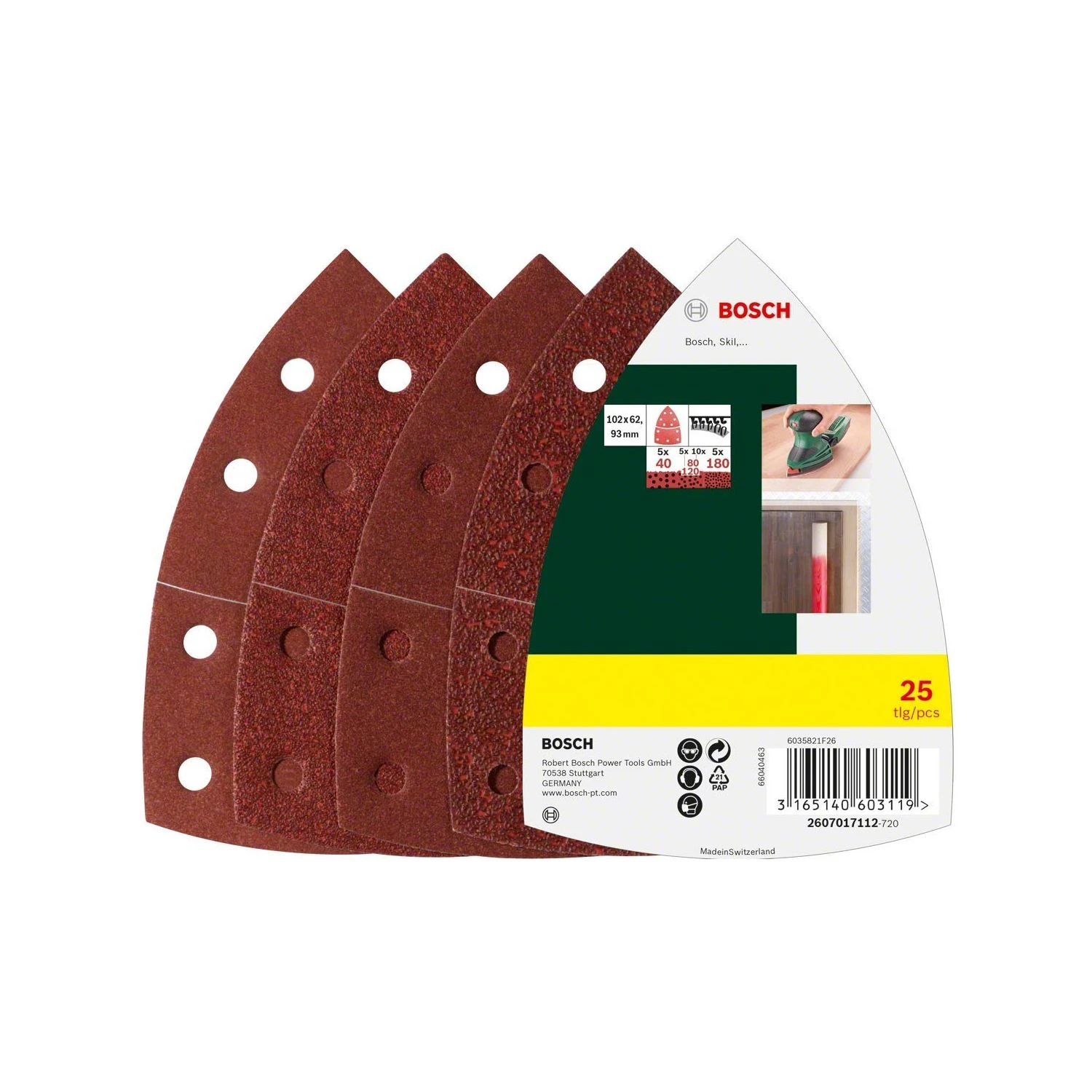 The Bosch 170 x 98 x 20mm Delta Sander Mixed Grit Sanding Sheet Set 25pc can help you with a variety of sanding tasks. Whether you want to do precise detail sanding in corners, along edges or even on small surfaces with multi-sanders, this set will help you achieve great results. It is perfect for professional tradespeople and DIY enthusiasts as it works to a high-performance level, delivering excellent final looks from your sanding.