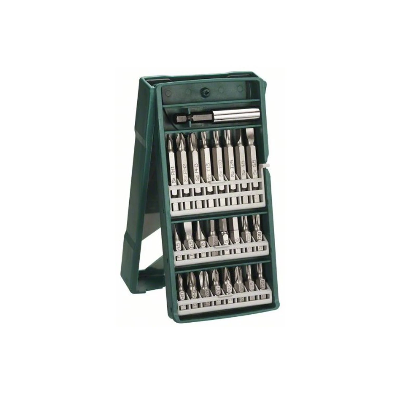 - 24 screwdriver bits for the 5 important screw types, in all standard sizes, 25 and 50 mm long, for all fixing jobs in the home and garage.
