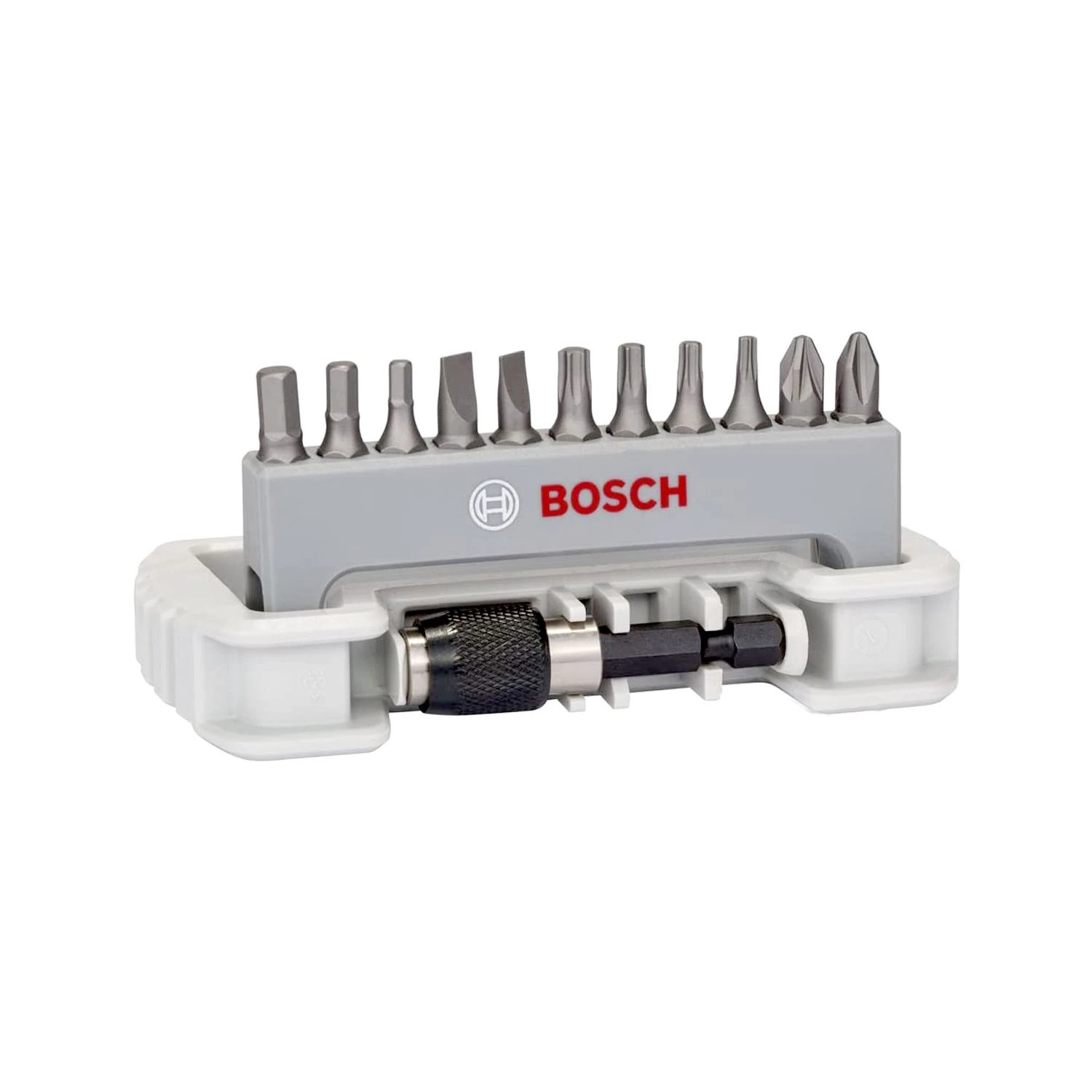 Bosch 11 pcs Screwdriver bit set extra hard. Bits length 25 mm, ISO 1173 C6.3, with quick-change universal holder. PH 2, PZ 2; T10; T15; T20; T25; S0,6×4,5; S0,8×5,5; HEX 3; 4; 5; 25 mm.