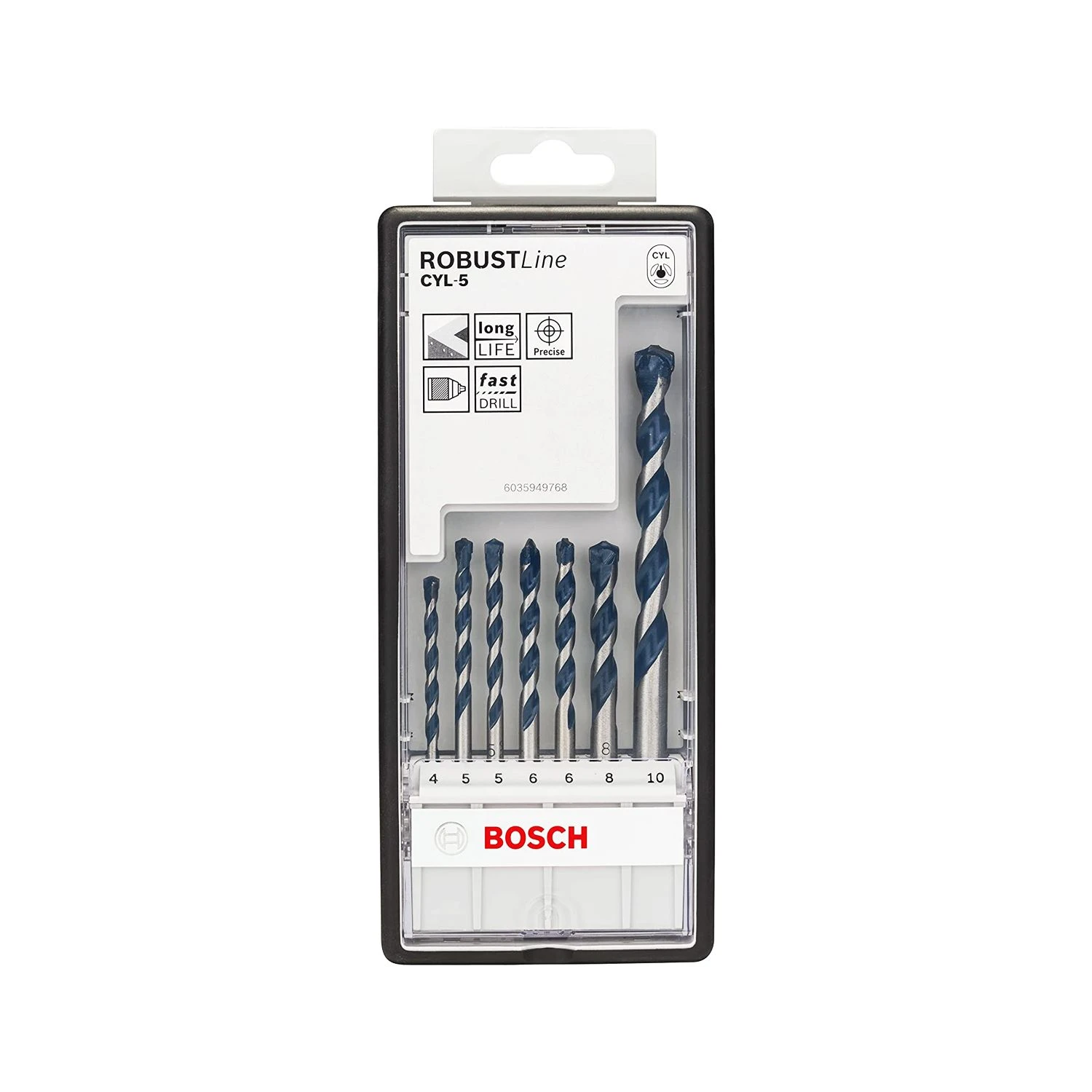The Bosch 2608588167 CYL-5 Concrete Drill Bit Set features 7 robust drill bits ideal for drilling concrete and stone. With extra-long durability guaranteed, each drill bit is perfectly adapted to withstand repeated use. Each bit features a carbide blend and diamond-ground cutting edge. This ensures high wear resistance when drilling hard materials including granite, masonry, concrete, and natural stone. Its 2-flute U-shape design with variable incline reduces wear reduction and increases dust removal. This provides a long-lasting performance and ensures a reliable and extended lifetime. Designed for professional tradesmen and DIY enthusiasts, this product is compatible with cylindrical shaft systems for all corded or cordless impact drills.