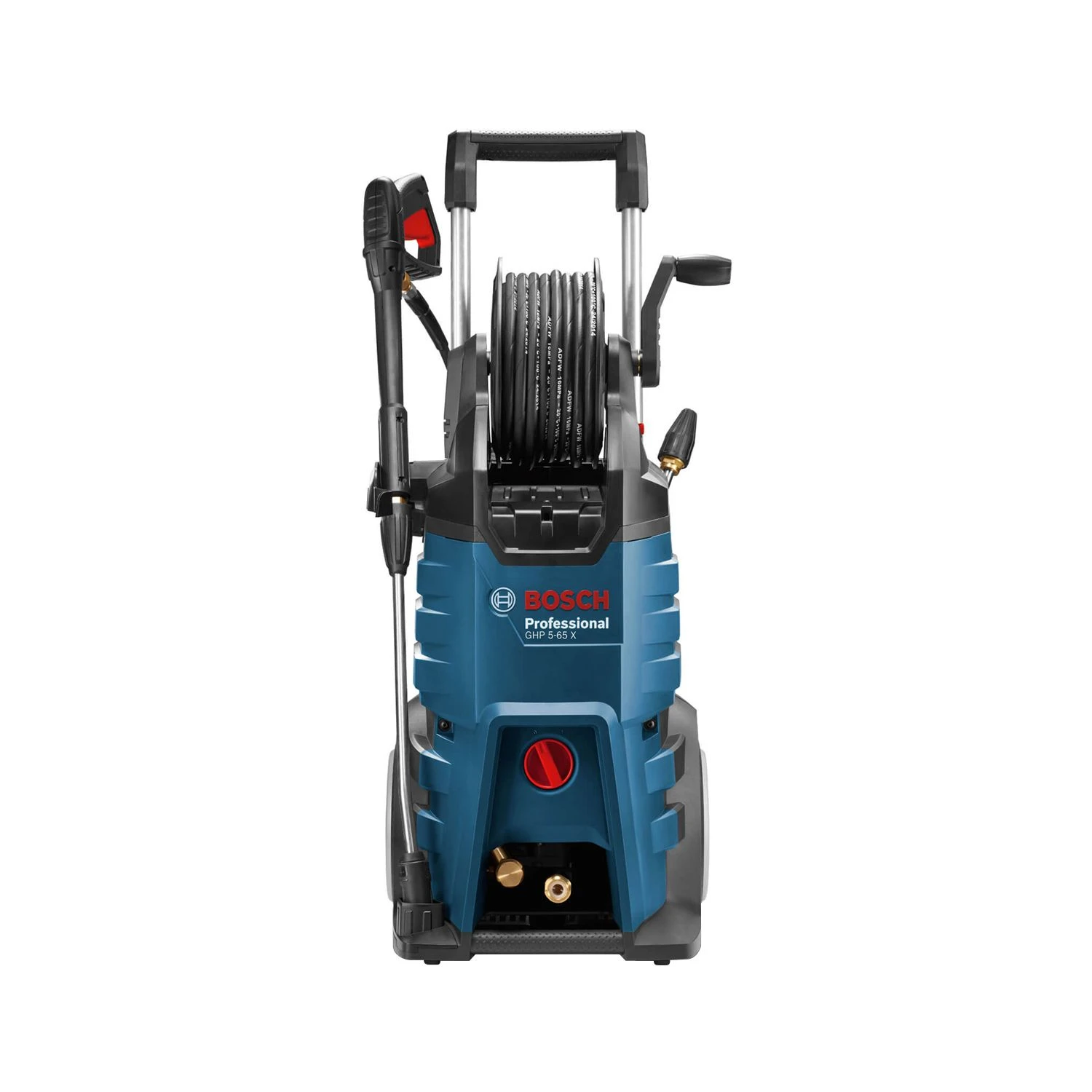 Bosch model GHP 5-65 X features and aluminium anodised pump with stainless steel pistons producing a combination of high flow and pressure resulting in high cleaning power. With a convenient metal telescopic handle for ease of use. Mobile and space-saving due to hose reel. Can be used both in horizontal and vertical positions and the self-priming system can draw water from external water source. With automatic motor and pump stop reducing the consumption of electricity and water.