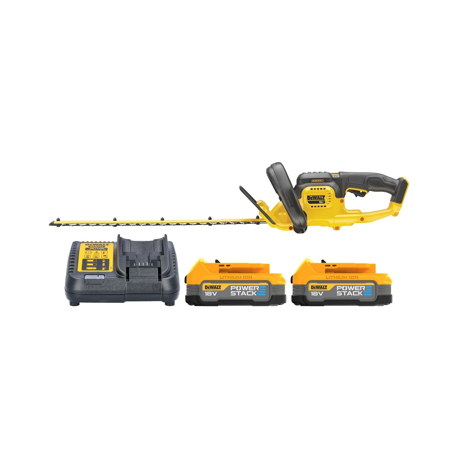 - Dual-action blades: The dual-action, 55cm hardened-steel blades on this 18V hedge trimmer from DeWalt offer a laser-cut, running backwards and forwards for the cleanest, best possible result