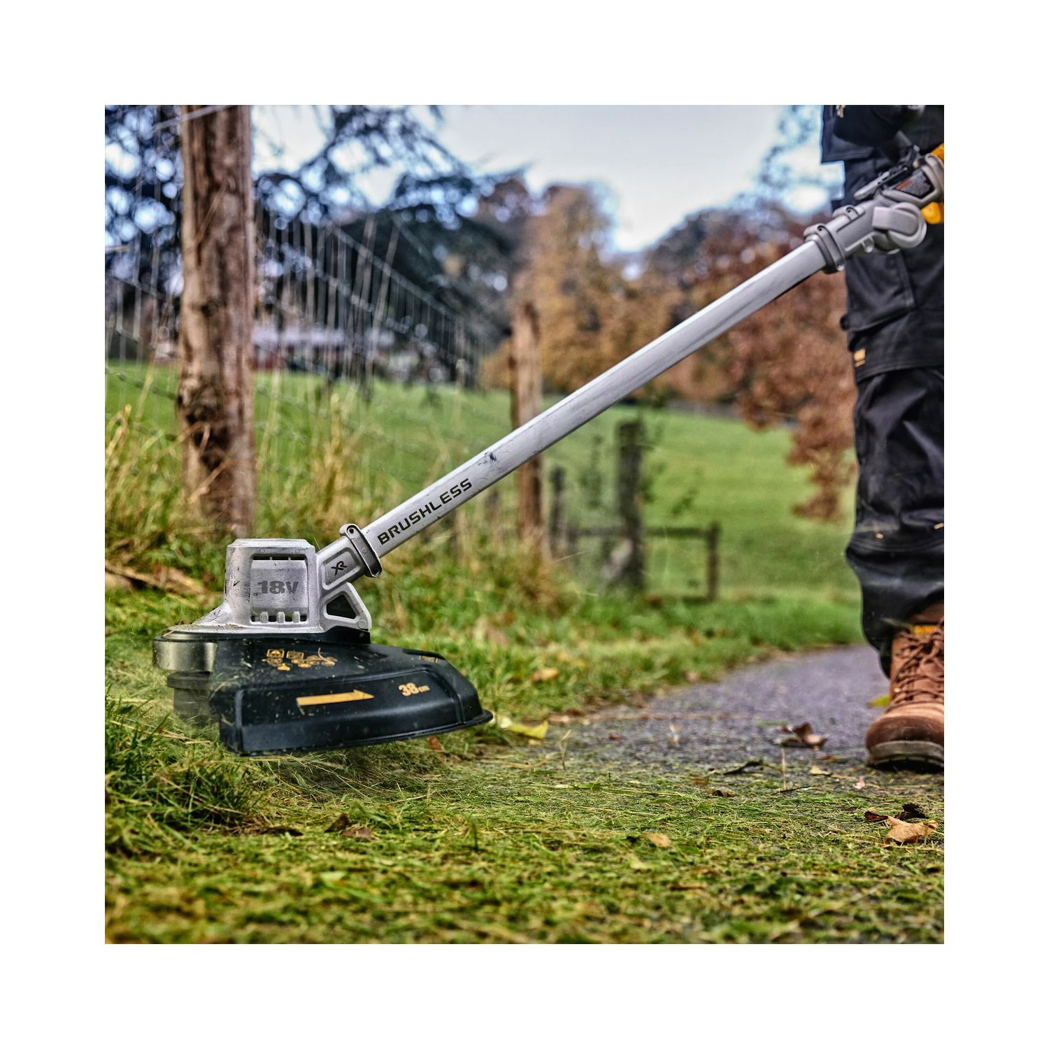 The Dewalt 18V XR BL String Trimmer Bare Unit DCMST561N-XJ is an ideal string trimmer for trade professionals such as gardeners and DIYers for personal use. It brushless motor ensure maximum power and helps maintain maximum power when working under load. It can provide more torque thanks to the 400 MWO brushless motor patented gear drive. Its fully variable trigger provides the user with full control and ensures a fantastic job. The ergonomically deisgned padded rubber aux handle ensures optimal comfort for the user and reduces user fatigue. This tool delivers versatility as well as durability thanks to its two-speed control and as it is battery powered it is much more convenient to move around, transport and use. It has been designed with a professional style guard giving the user more cut access and better visibility, making it an all round brilliant tool.