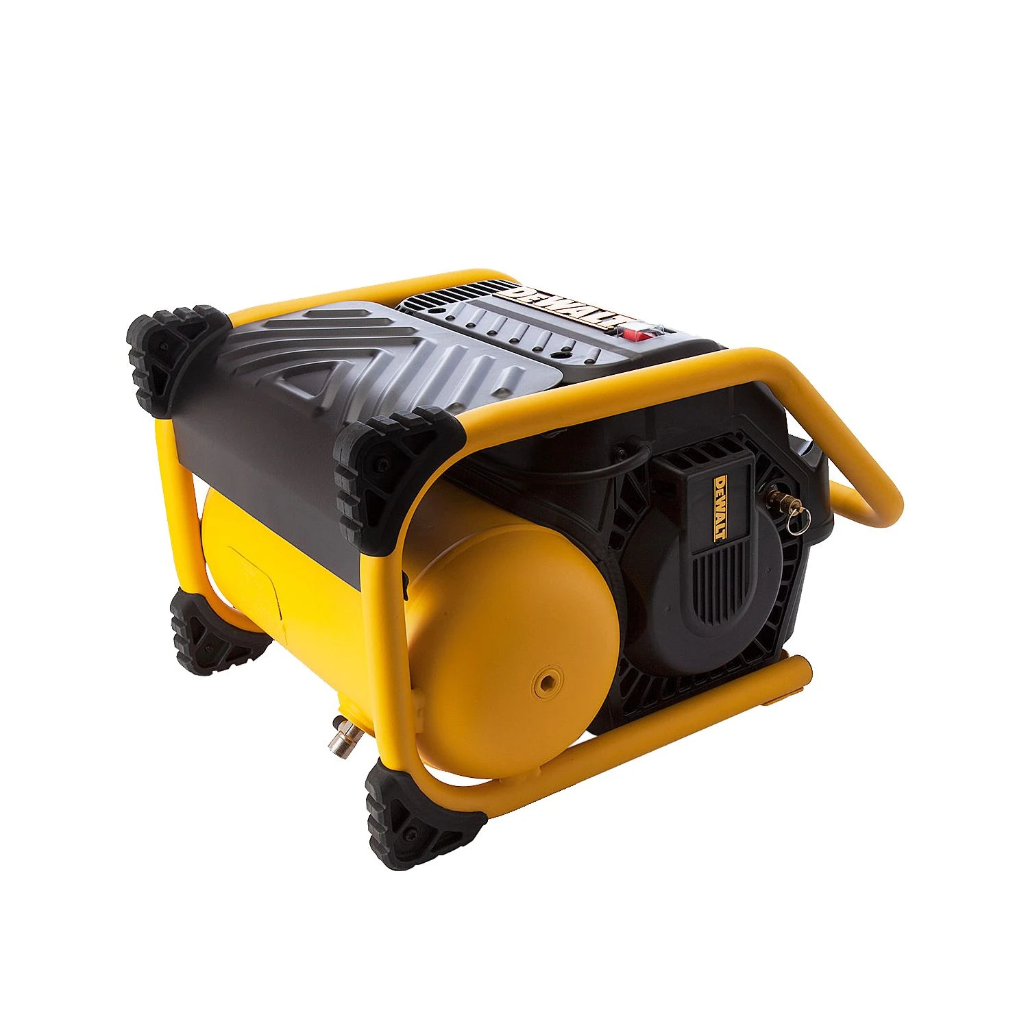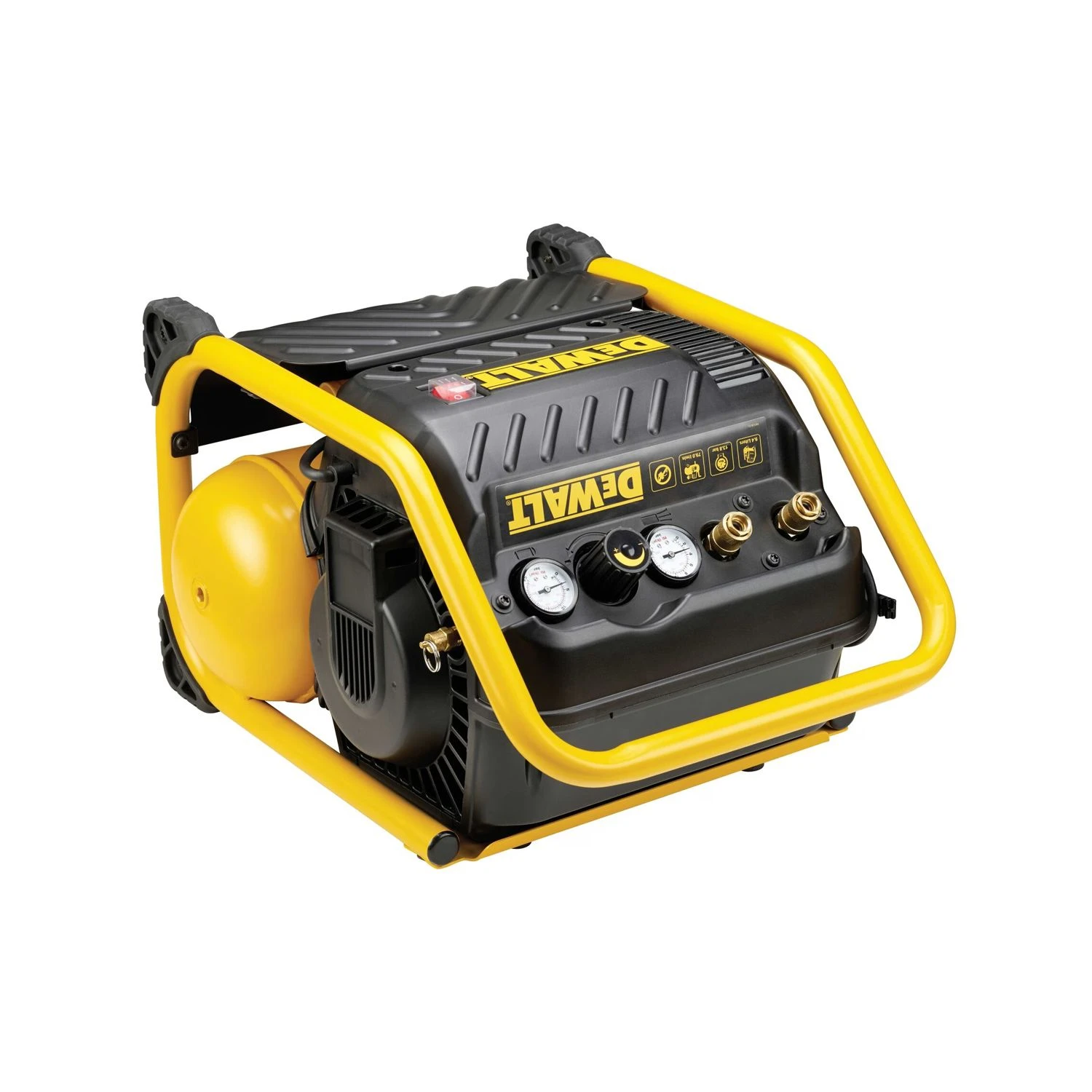 The DEWALT DPC10QTC Mid Pressure Super Quiet Compressor has been designed for framing and finishing applications. It has a durable oil free pump that provides extended maintenance-free operation. The compressor can be operated/stored in either the vertical or horizontal position. With a roll cage and control panel that provides protection to key compressor components.