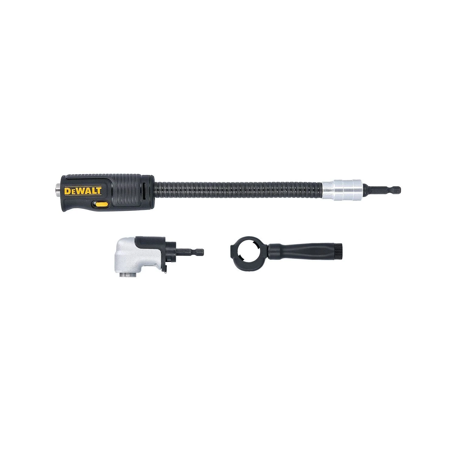 The DeWalt 1/4inch Impact Flexi Attachment is designed to go with the DeWalt Right Angle Head Attachment to access difficult to reach spaces. This attachment would be used mostly by trade professionals. It can be used in conjunction with impact drivers and cordless drills. It has 43Nm of torque and has 180degree flexibility, so you can access spaces around a corner and at a angle. It really is such a useful attachment to have, if you frequently find yourselves working in these hard-to-reach spaces. It has a Patented handle design, which reduces vibration. This gives the user much more control and comfort for the job at hand. Supplied as a single unit.