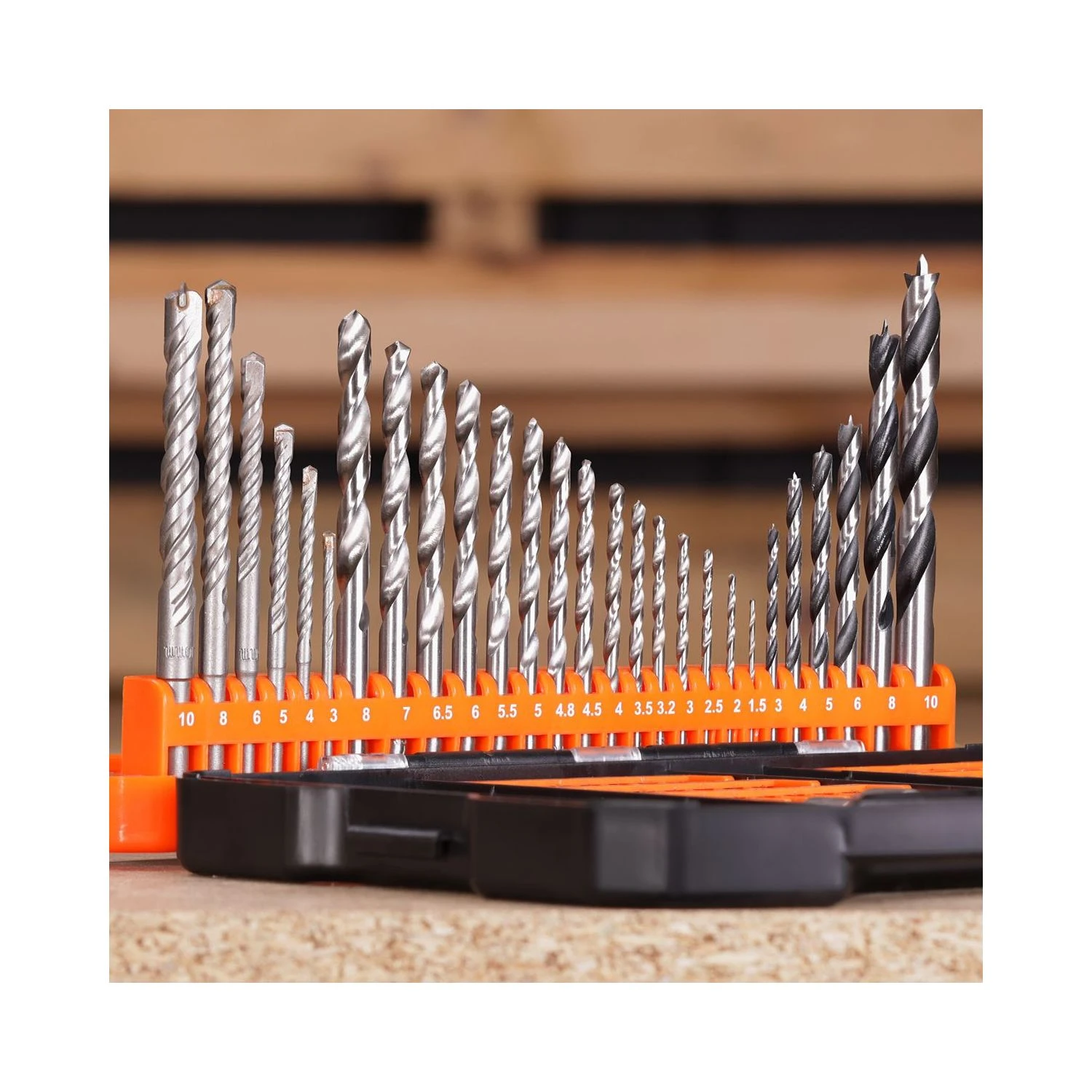 High quality drill & screwdriver bits set makes a great addition to your home, workshop toolbox or back of a handyman’s van. This compact kit comes with your most popular bit sizes to get you through any working scenario. Included in the set is your 15pcs hss, 6pcs masonry, 6pcs wood drill bits. Accessories included are 48pcs 25mm S2 bits, 7pcs 50mm S2 bits. 1pcs countersink, 9pcs nut driver, 4pcs drill stopper, 1pcs magnetic holder, 3pcs flat wood bits and 1pcs hex key. Specially made from fortified S2 Steel. Ultra strong and durable drill bits.