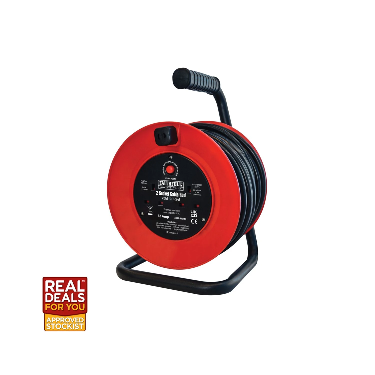 The Faithfull Open Drum Cable Reel features twin 240V sockets and a thermal overload protection system to prevent overheating damaging the cable when in use. The heavy-duty plastic drum is mounted on a sturdy steel frame with a textured grip for user comfort. Its 1.25mm² cable is fitted with a standard 240V plug. Complies to BS EN 61242.