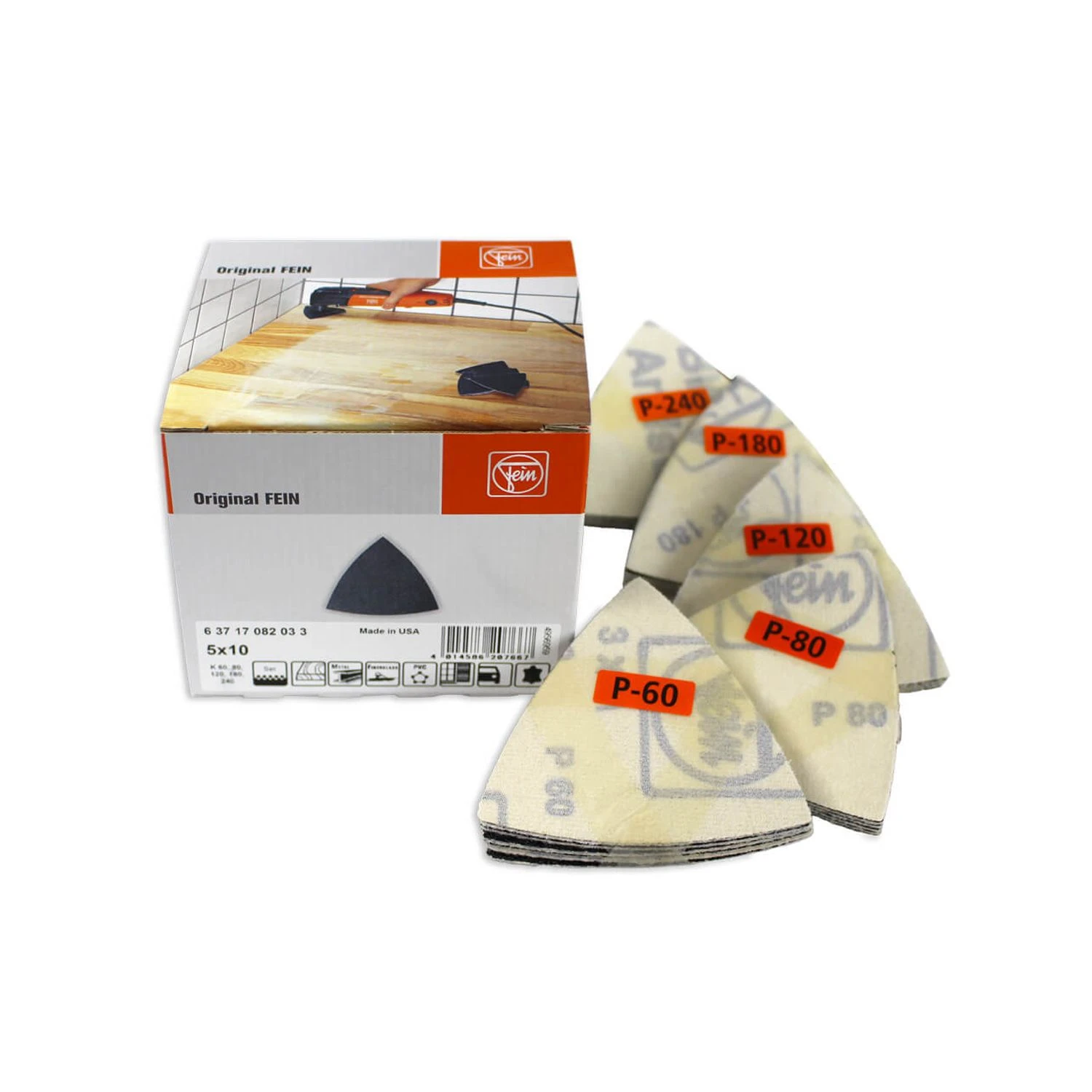 - 10 sheets per set, with Velcro rapid attachment 60, 80, 120, 180, 240 grit.