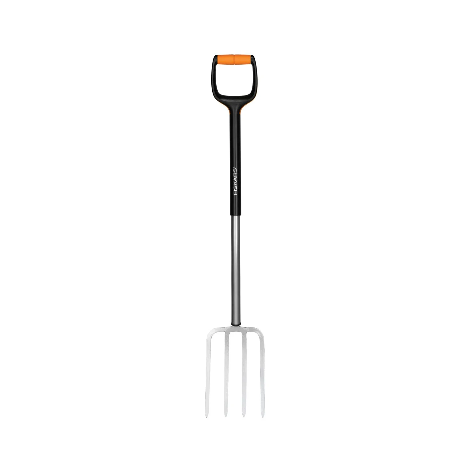 The Fiskars Xact™ Soil Work Fork is a lightweight but sturdy tool with a forged-steel head and solid tines for easy penetration into hard soil. Its shaft is made of composite and steel and fitted with a SoftGrip™ padded Push-Pull D-handle that offers increased control and comfort.