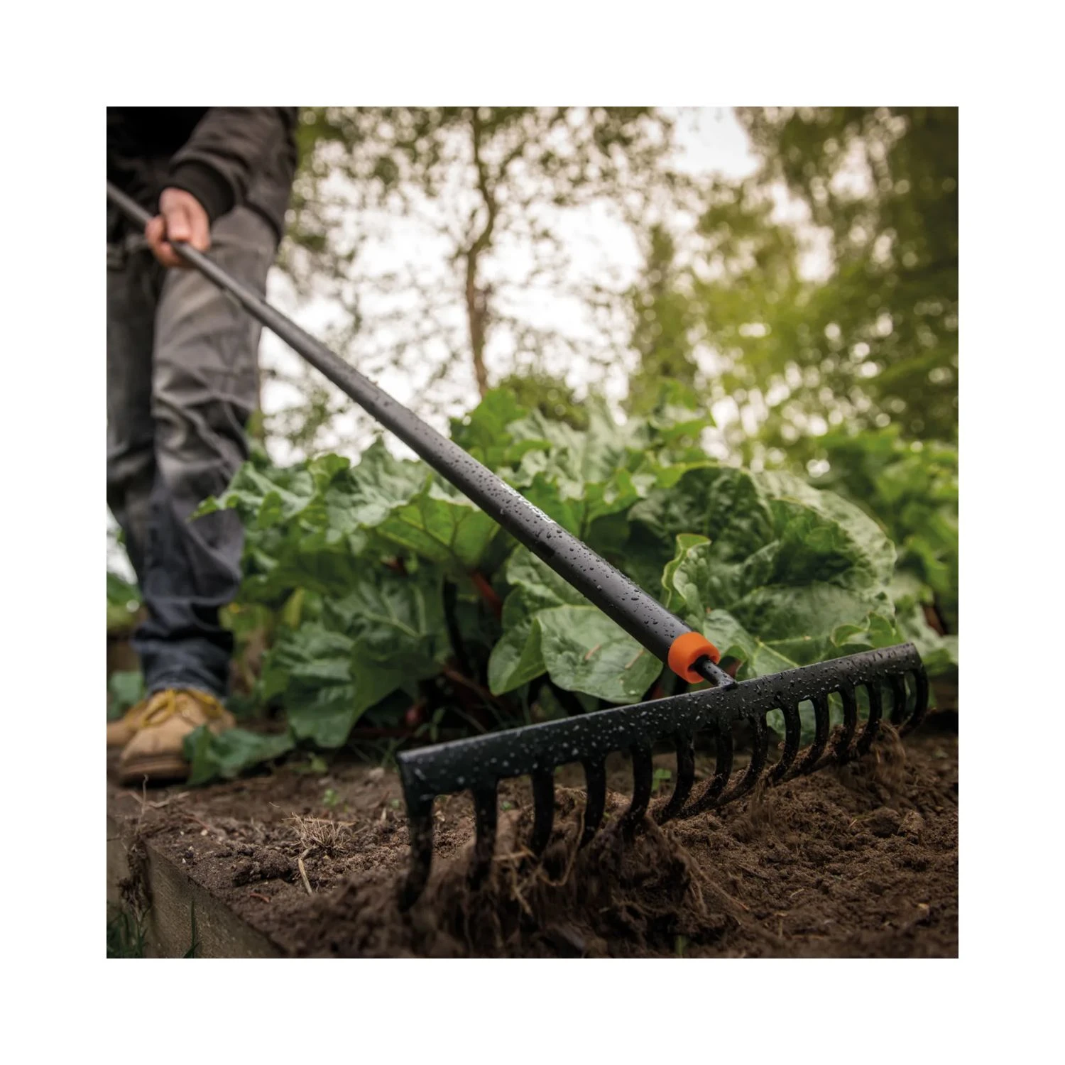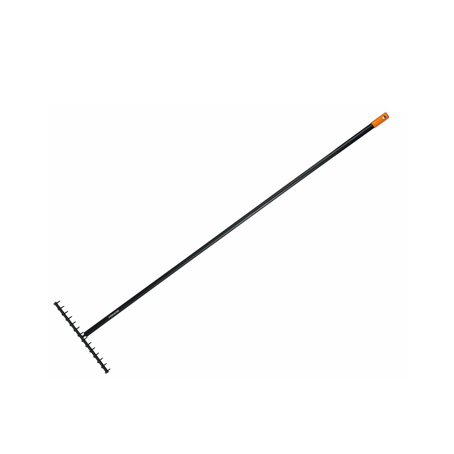 The Fiskars 135715 Solid™ Soil Rake has hardened carbon steel blades for preparing planting beds, smoothing down soil and other general gardening tasks like raking branches or spreading mulch. The rounded aluminium shaft makes it extremely durable, and lightweight.