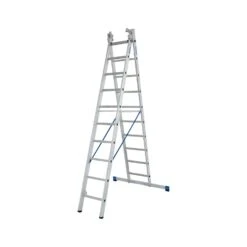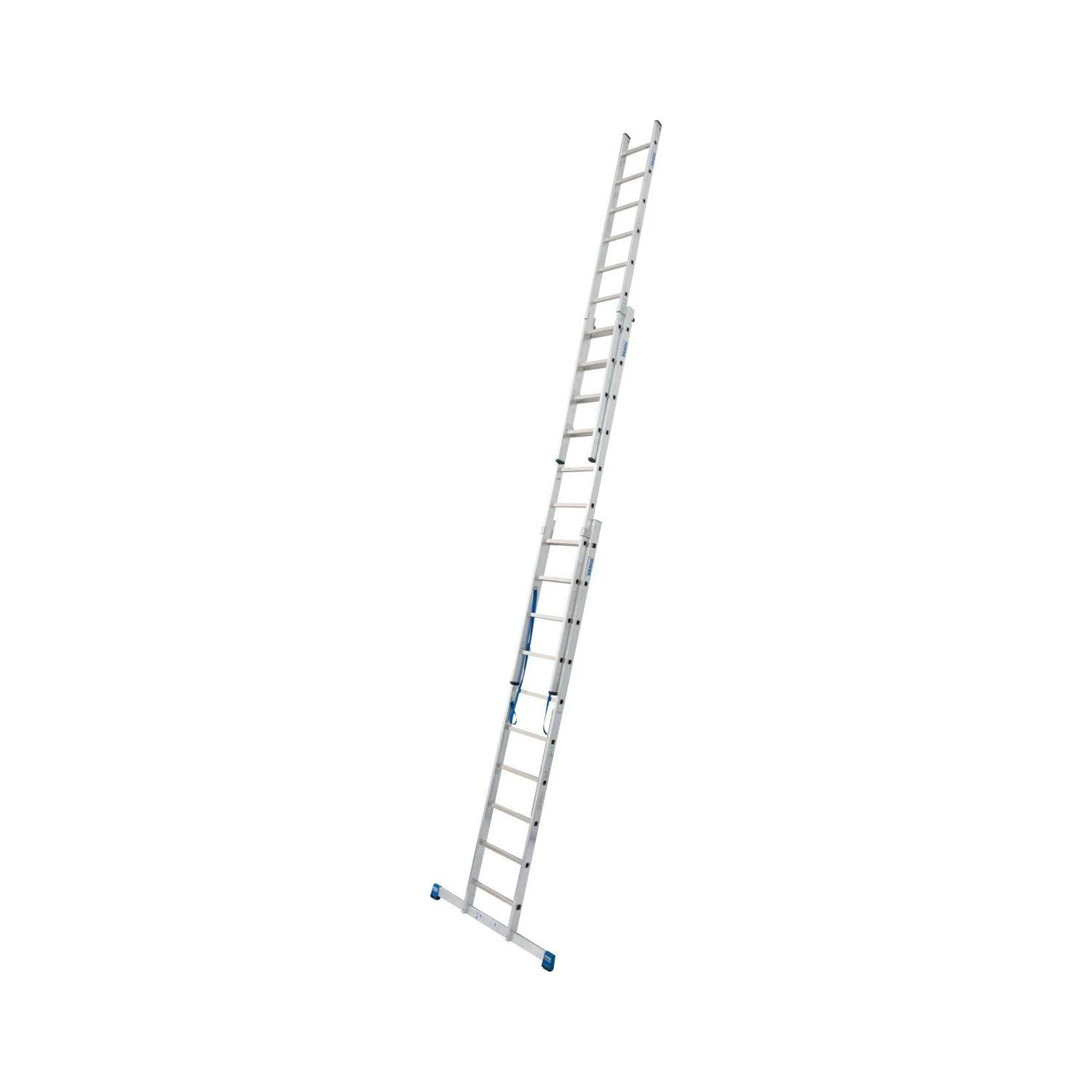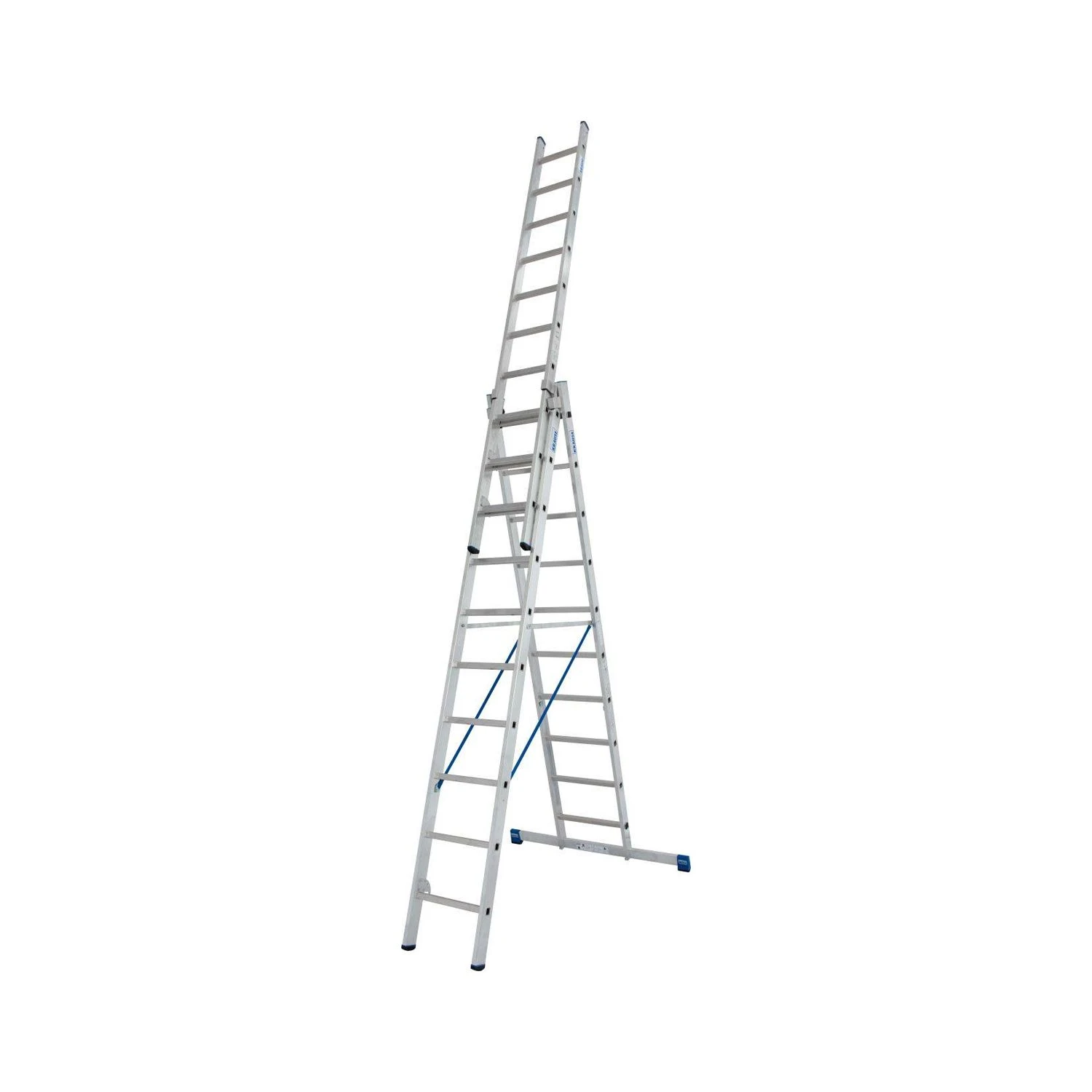 Three-section aluminium combination ladder usable as a leaning, extension and freestanding ladder with an extendable and individually removable ladder section.