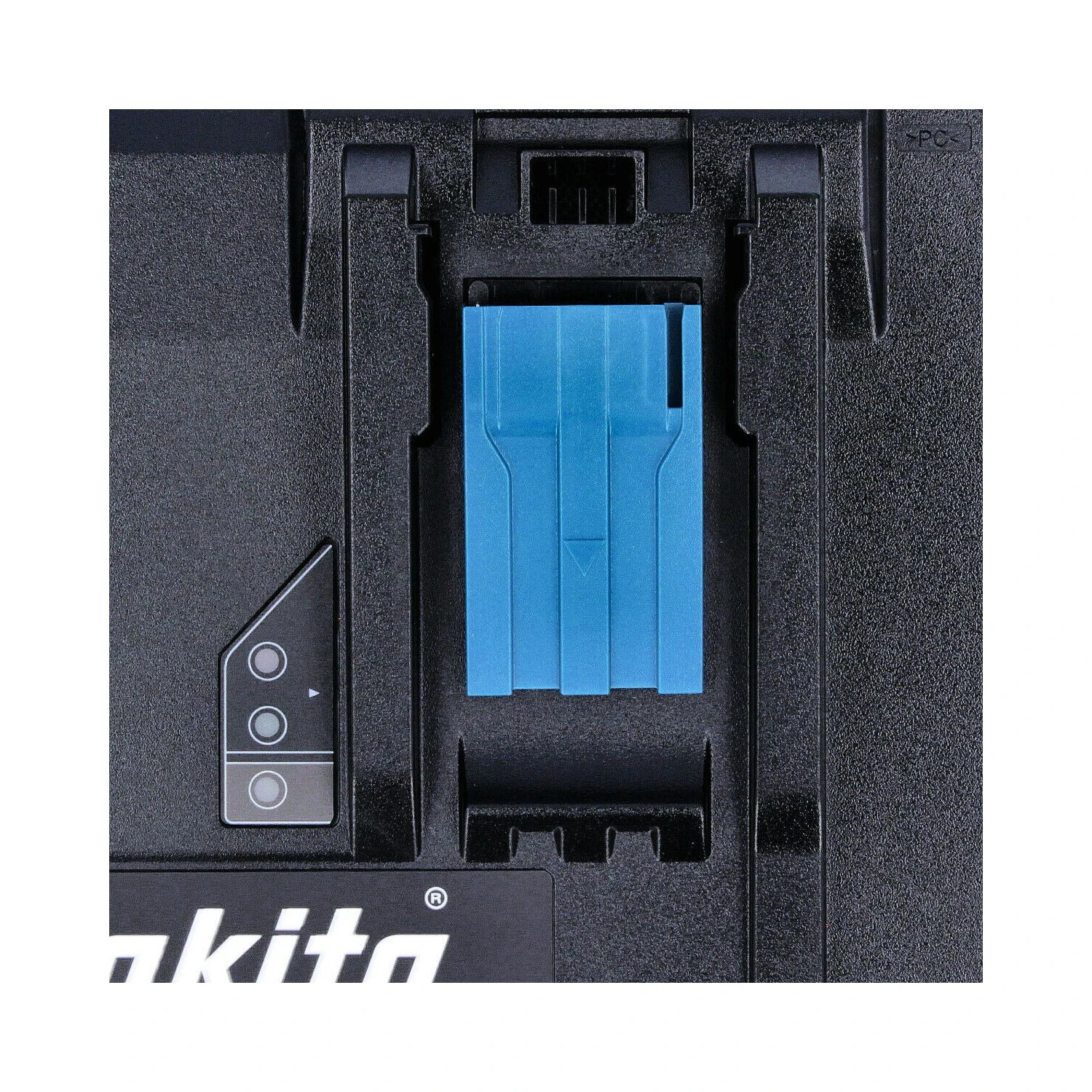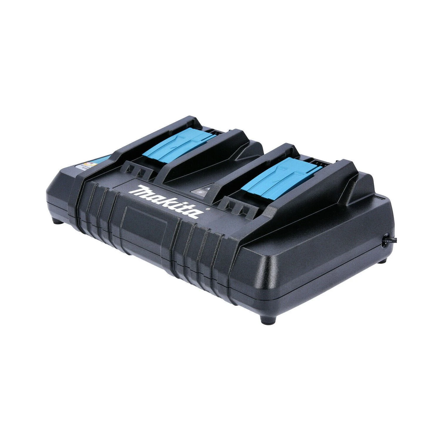 The Makita DC18RD/1 110V twin 18V Li-ion charger, charges 2 batteries simultaneously. The rapid charge technology selects the optimum voltage and current and temperature is controlled by the forced air system that circulates air through the battery to prevent overheating. and a full charge sound alert confirms when the charge cycle is complete.