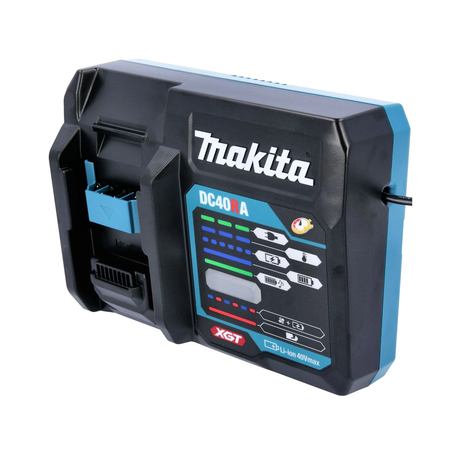 The Makita DC40RA is a fast charger developed for charging XGT Li-Ion batteries. Equipped with two cooling fans, one for the battery and the other for the charging circuit enabling it to charge consecutive batteries at the optimum charge time.