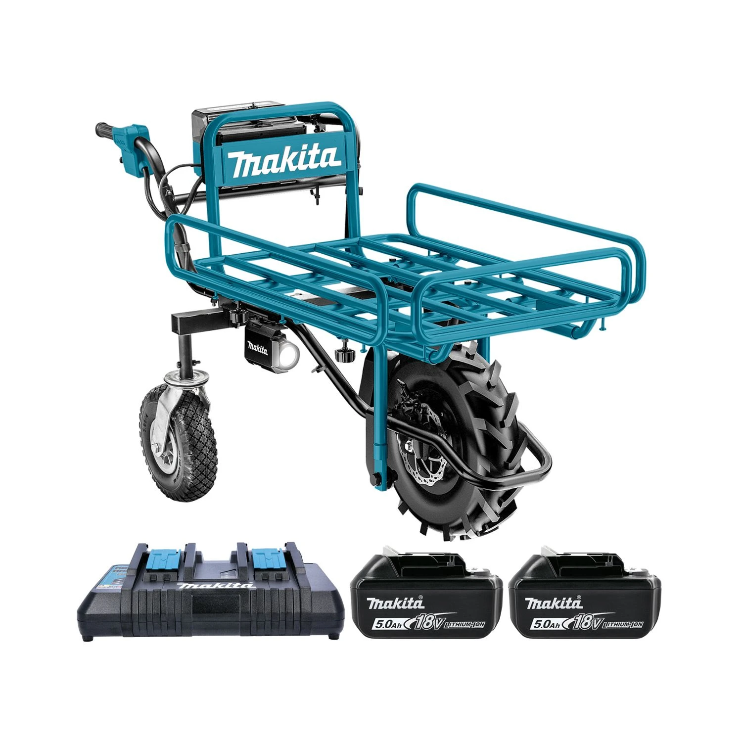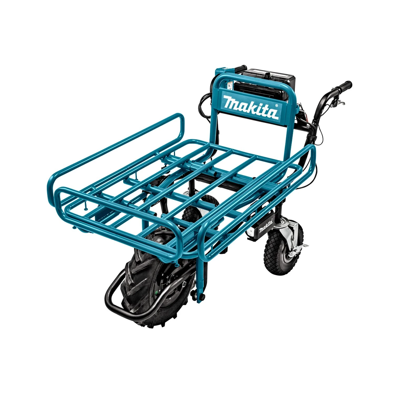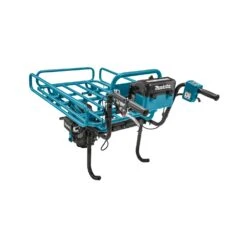 The Makita DCU180PTX3 battery operated wheelbarrow makes light work of heavy loads without back breaking work for the user. Designed with electronic 2 speed selection and a reverse gear making it more versatile and easy to use. The 3 stage adjustable handle will suit all users making it the perfect height for maximum comfort which also folds for compact storage. Featuring a brake lever with locking mechanism so you can lock the wheelbarrow in place when filling or emptying, even on a slope.
