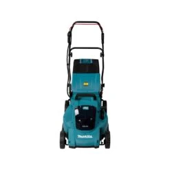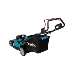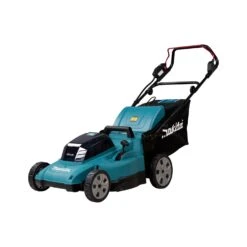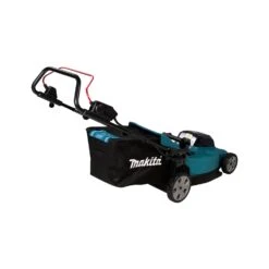 The Makita DLM480CT2 36V Twin 18V 480mm Lawnmower LXT is a hardy and durable mowing machine ideal for lawns of up to 800m². Its high grip PVC tyres are large and robust, making them ideal for tackling muddy or difficult terrain. The cutting deck is water resistant, and has been streamlined to achieve a higher level of efficiency in grass collection. The cutting level is easily adjusted via handle, and the mower features a grass catcher with grass level indicator. Safety features include an electric brake, a lock-off/lock-on switch, and an anti-restart function. The machine is IPX4 level water resistant, and ideal for professional and DIY use.