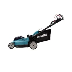 The Makita DLM481CT2 36V Twin 18V Self Propelled 480mm Lawnmower LXT is a hardy and durable mowing machine ideal for lawns of up to 650m². Its high grip PVC tyres are large and robust, making them ideal for tackling muddy or difficult terrain. The cutting deck is water resistant, and has been streamlined to achieve a higher level of efficiency in grass collection. The cutting level is easily adjusted via handle, and the mower features a grass catcher with grass level indicator. Safety features include an electric brake, a lock-off/lock-on switch, and an anti-restart function. The machine is IPX4 level water resistant, and ideal for professional and DIY use.