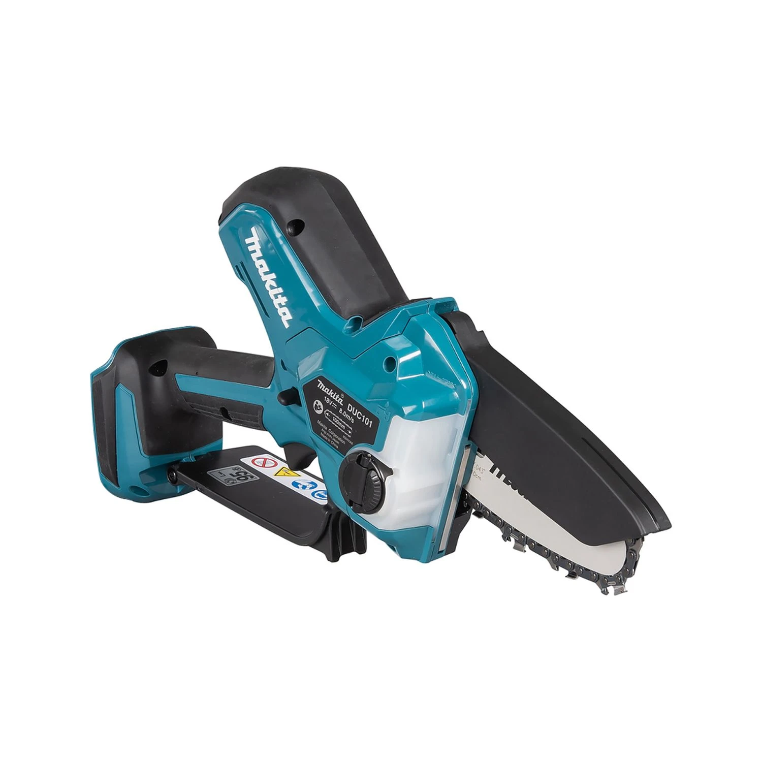 The Makita DUC101Z cordless brushless pruning saw is easy to use, lightweight and compact, enables easy pruning of garden or orchard trees. Features a moveable guard – covers the upper side of the guide bar and opens gradually wider as the saw chain cuts deeper in the branch. With automatic chain lubrication & chain oil view window. With a compact and handy design, the DUC101 pruning saws offer maximum flexibility and is ideal for pruning and precise corrective cuts. Chopping green waste and small cutting jobs in the garden are also possible without any problems. Equipped with a 100 mm bar and tool-less chain and bar tensioning. The new tool-free chain tensioner enables the chain to be changed quickly and easily by simply loosening and closing the lever. When adjusting the chain tension or changing the chain, always keep your safety in mind and wear suitable gloves to protect your hands.