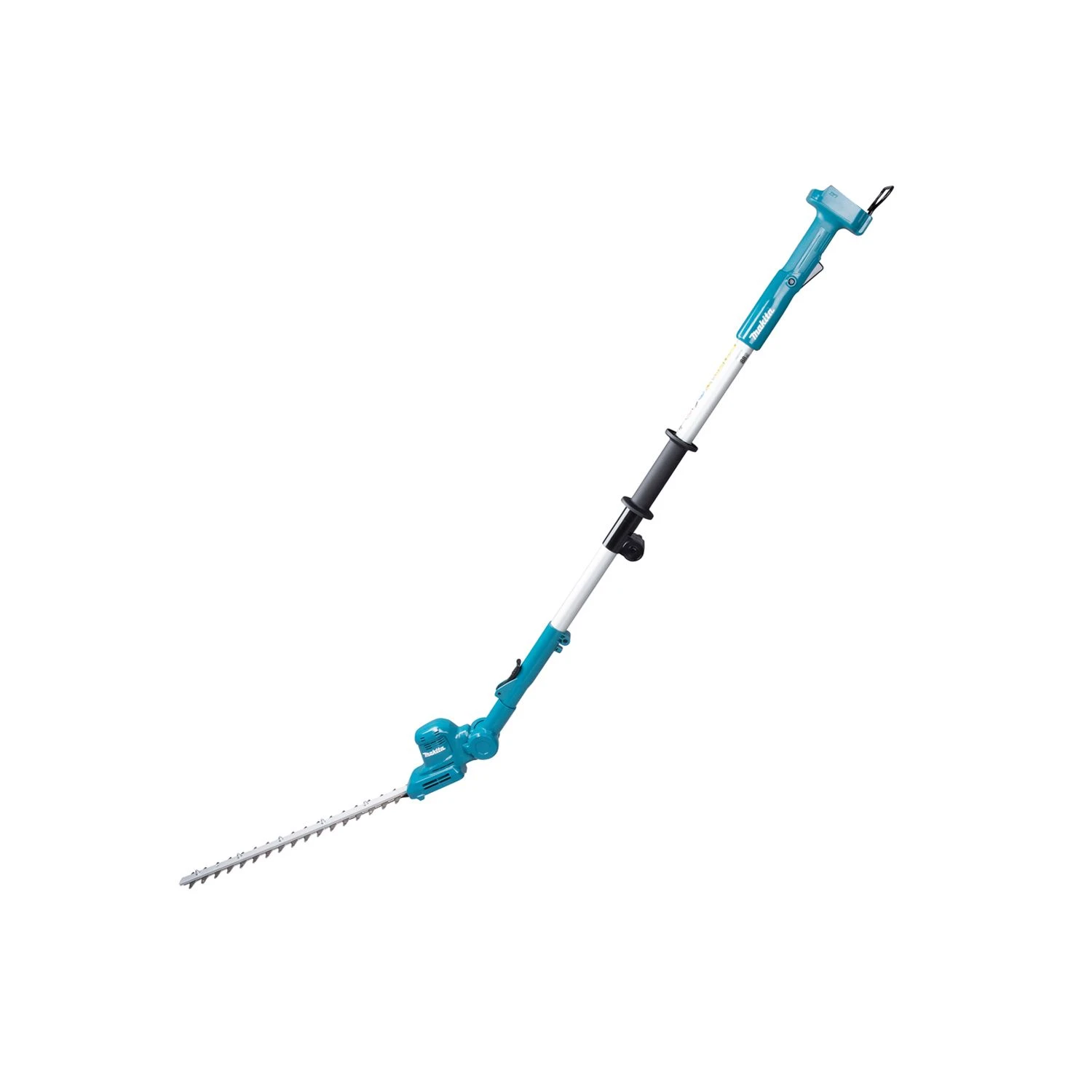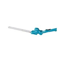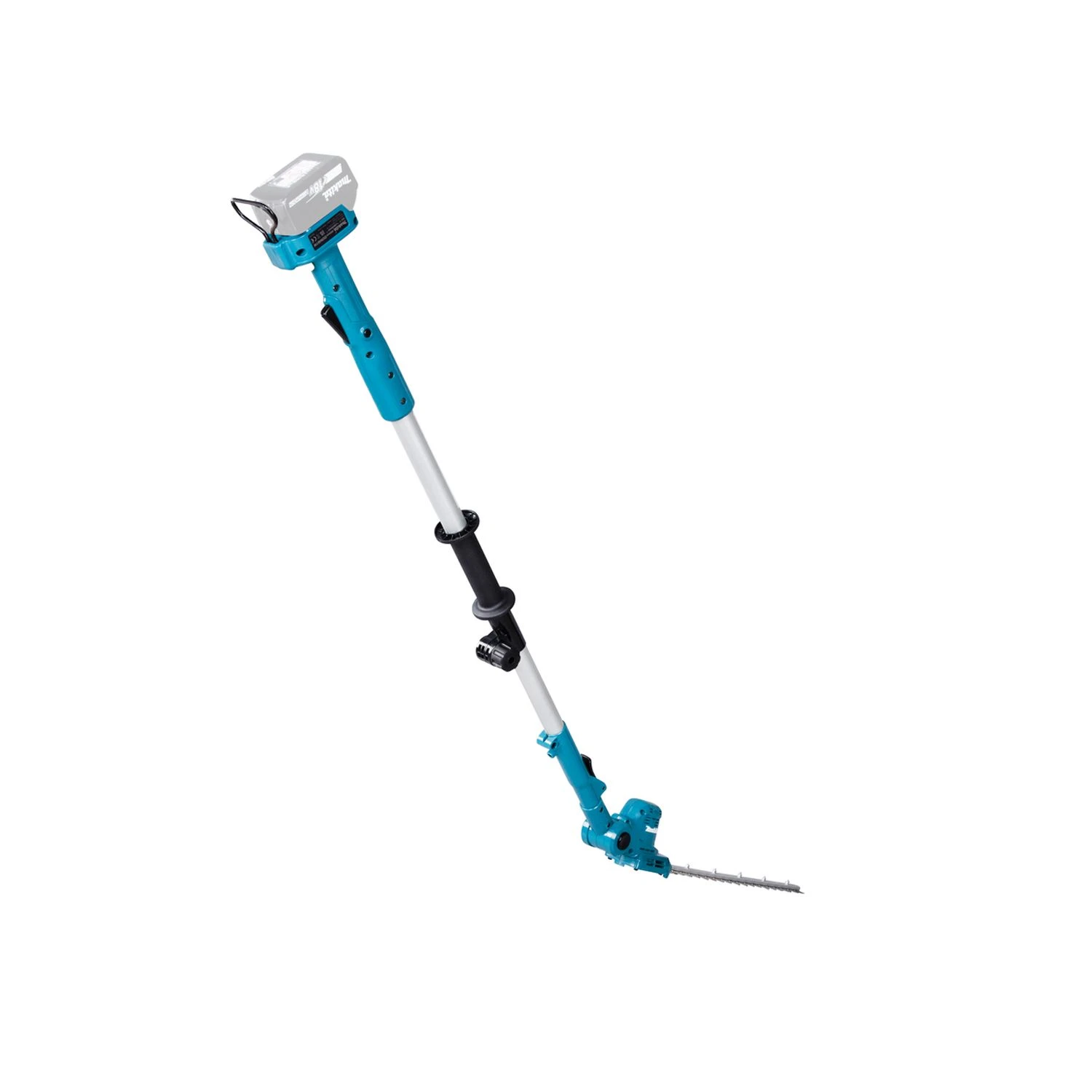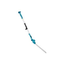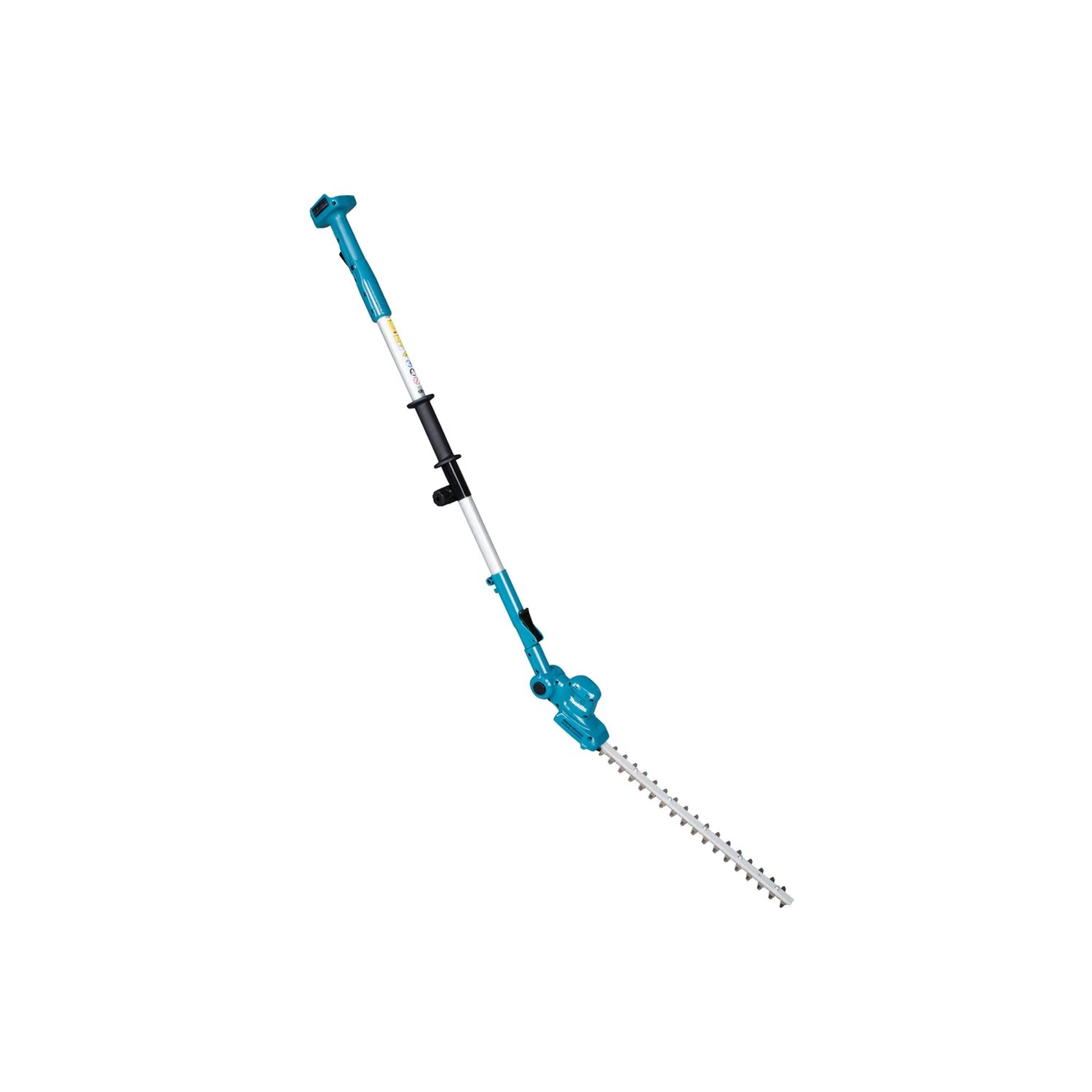 The Makita DUN461WZ 18V 46cm LXT Pole Hedge trimmer has an adjustable head that can tilt 60° up and 75° down. It features ten angle settings that can be activated and changed with a simple button push. The pipe is telescopic and allows the shaft length to e fully adjusted as required. The lock lever enables the adjustment of the pole extension to be completed without the need for tools. The slide-type front grip position can be adjusted for comfort and to improve efficiency whilst working in different positions and postures. When the tool is jammed by thick branches, the reverse rotation system can free the blade easily and swiftly. It has low noise and vibration emissions, with a lock-off function and a high cutting speed for efficient and smooth cutting. Ideal for DIY and professional users.