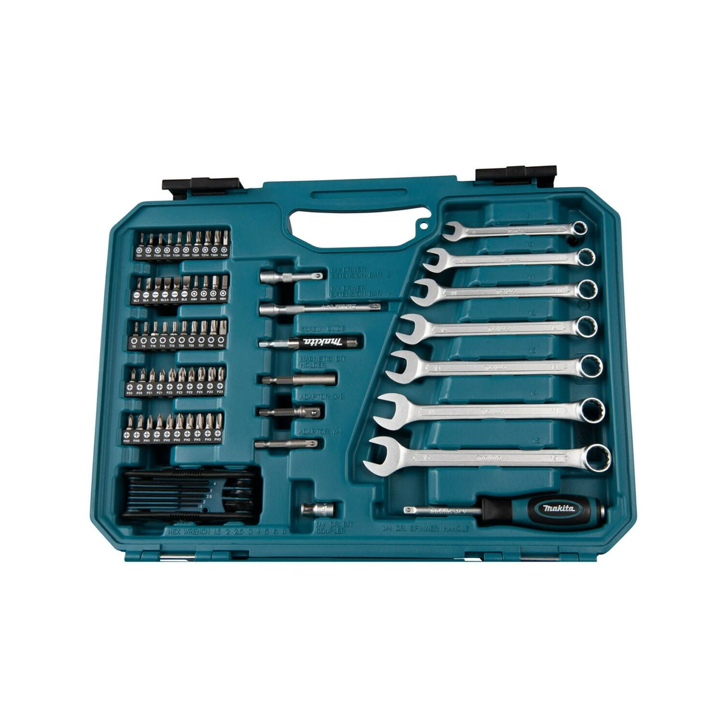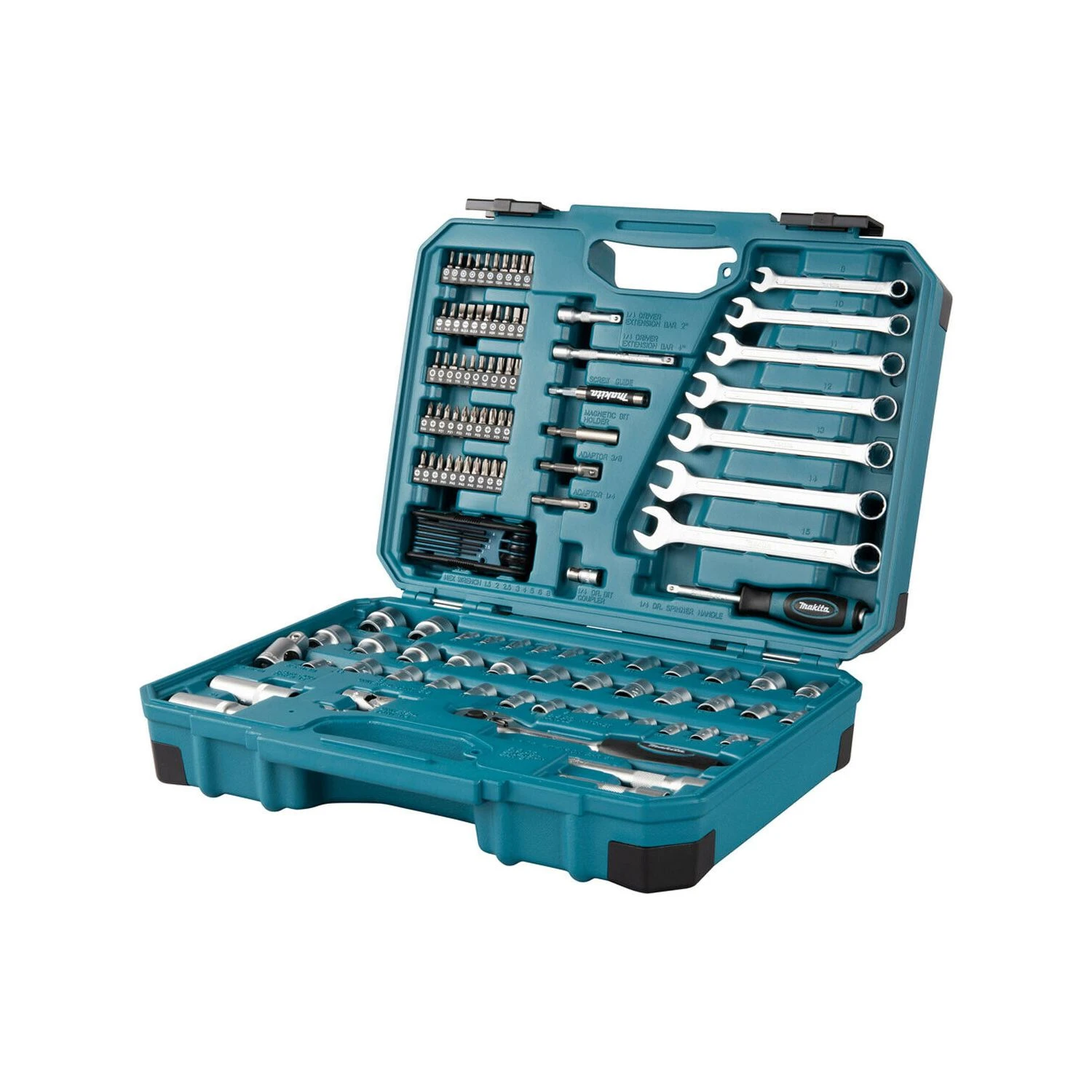 Makita is the leading manufacturer of professional power tools on the market. The E-06616 is a comprehensive, compact and easy to carry 120 Piece Maintenance Set, containing a variety of the most popular hand tools and accessories, ideal for car mechanics, construction industry workers, handymen, DIY enthusiasts and more. The E-06616, constructed from chrome vanadium steel, contains 50 screw bits, 7 piece open ended spanner set, 48 piece socket set with adapters, allen key set, 3/8” ratchet and ¼” bit screwdriver. The E-06616 is supplied in a blue plastic moulded case, 420mm x 312mm x 130mm.