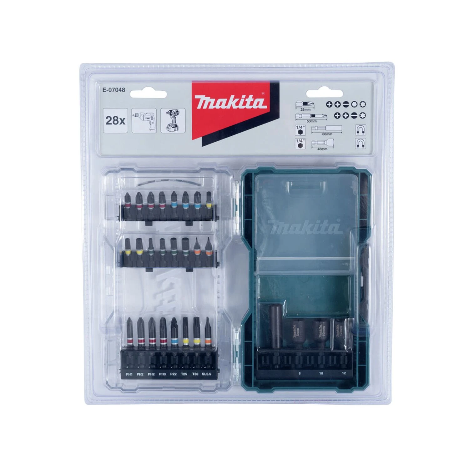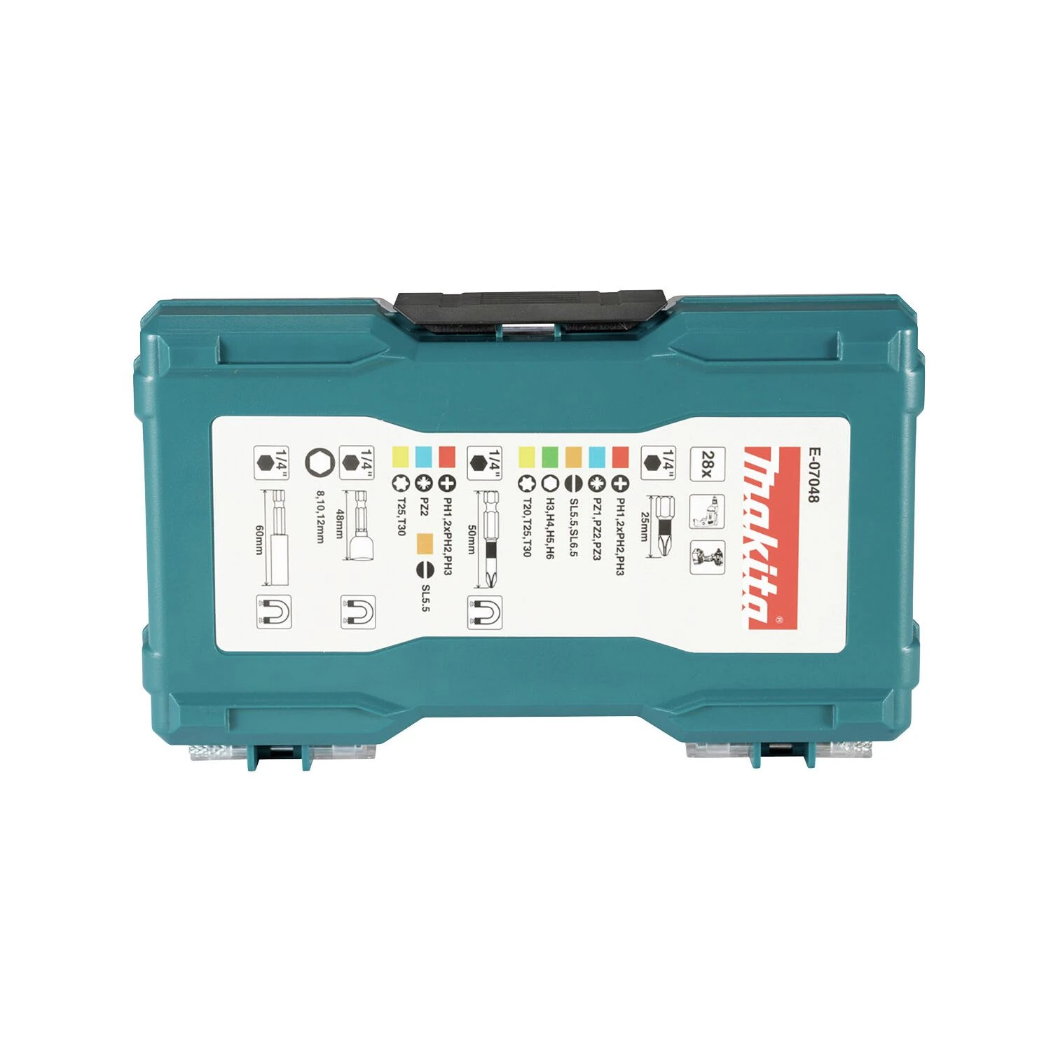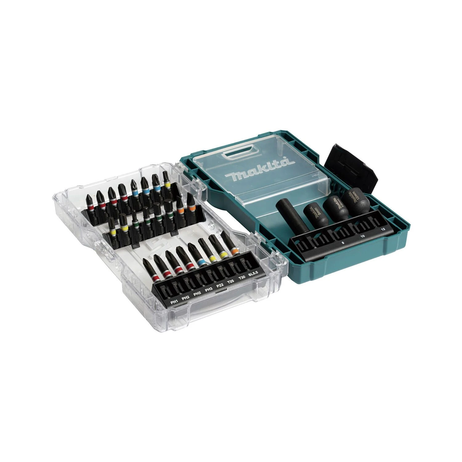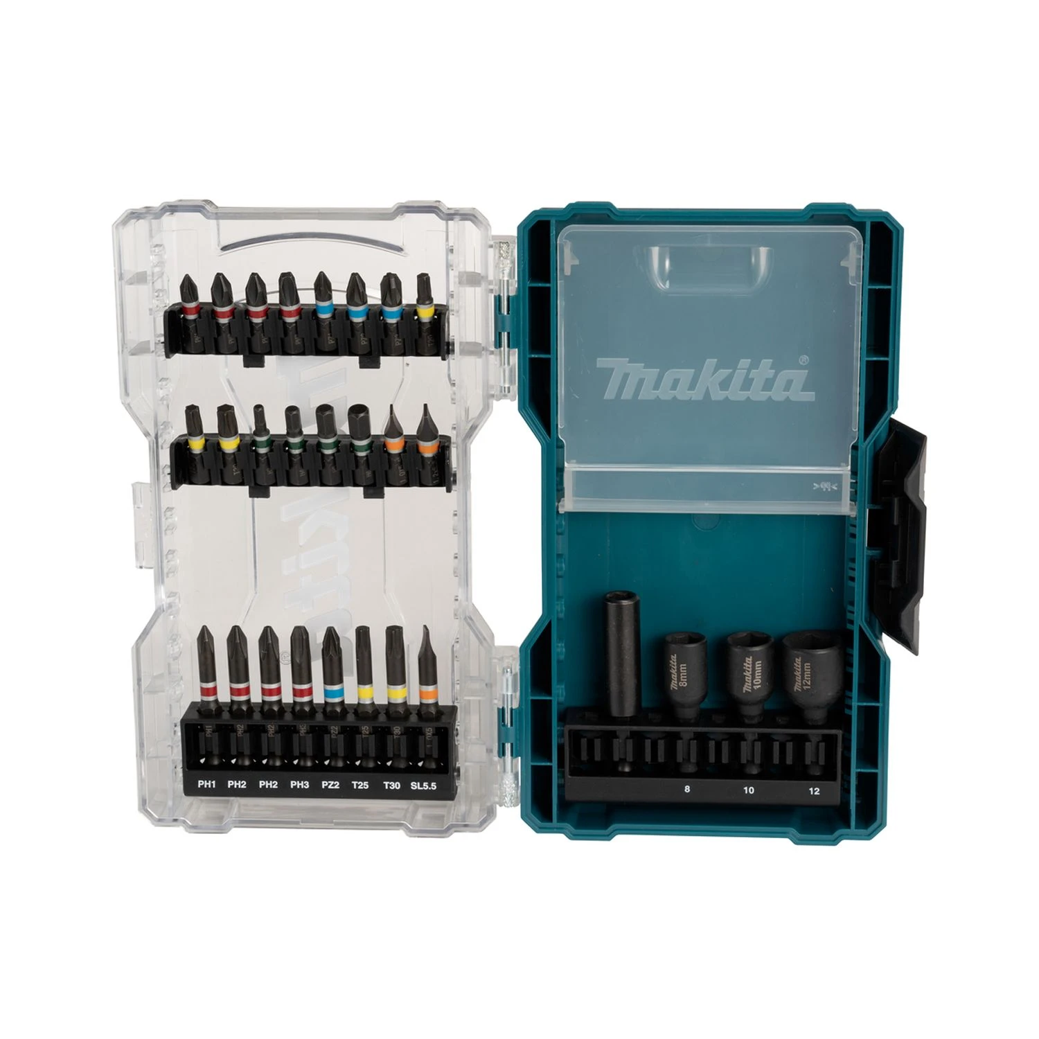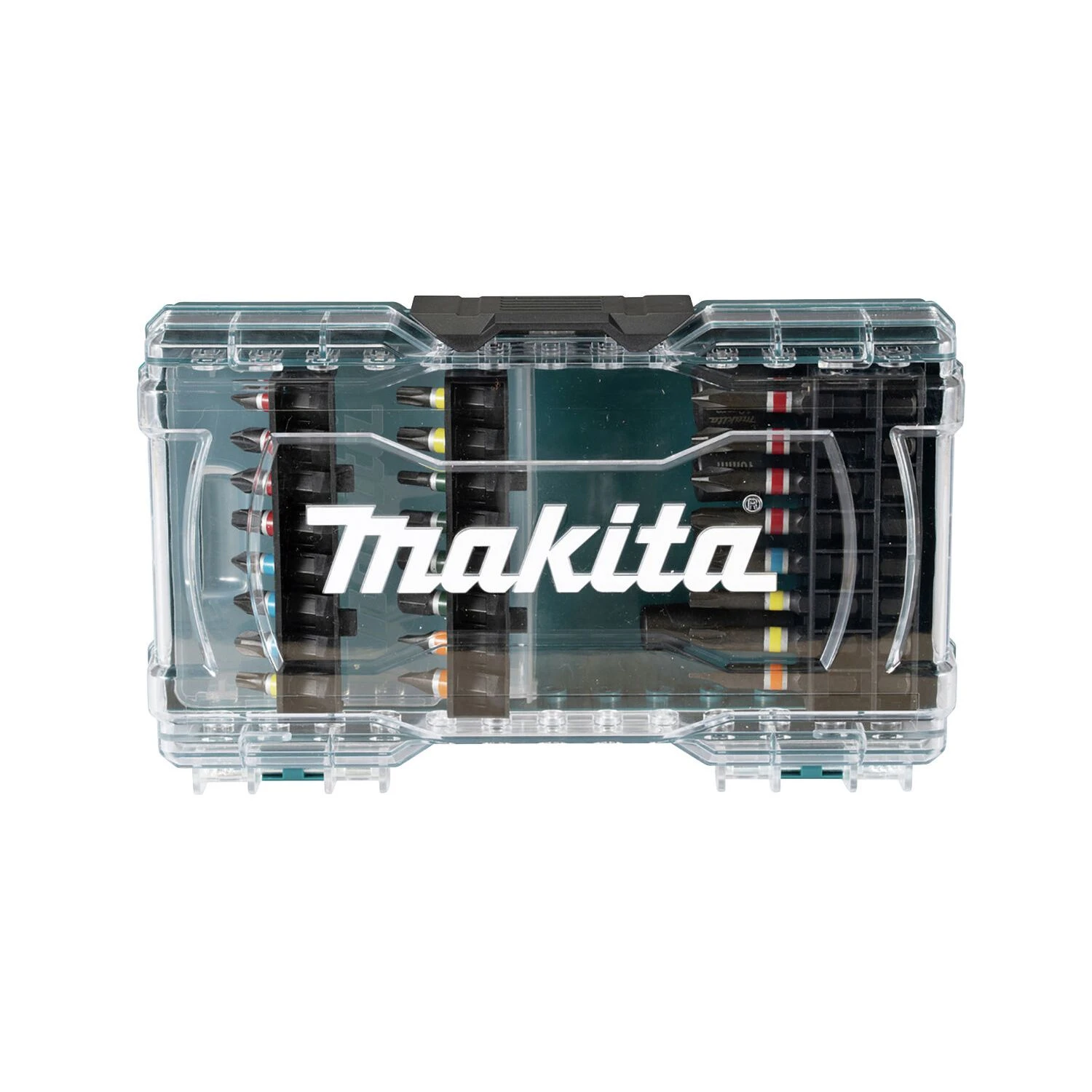 Makita 28 piece bit set in a clear plastic case, allows the user to easily identify the contents.