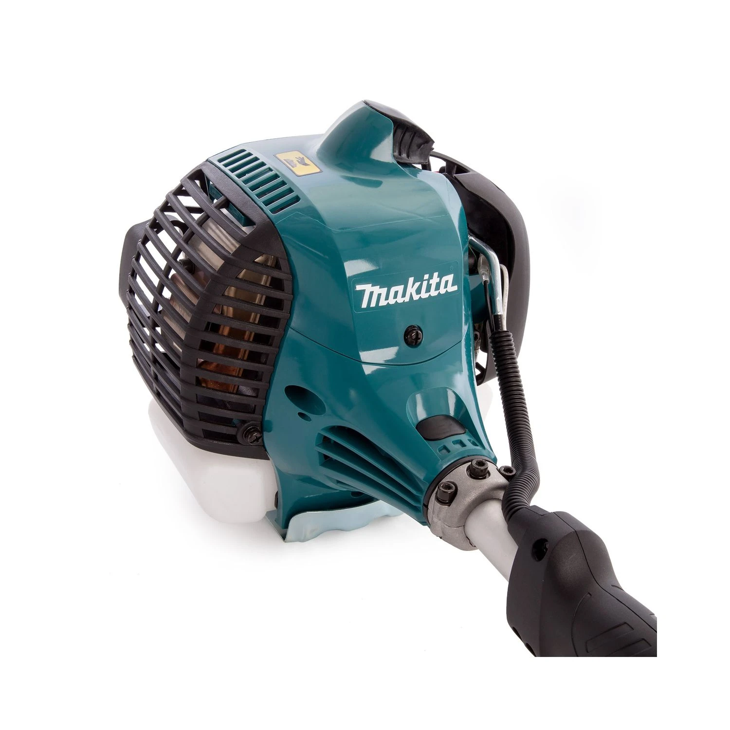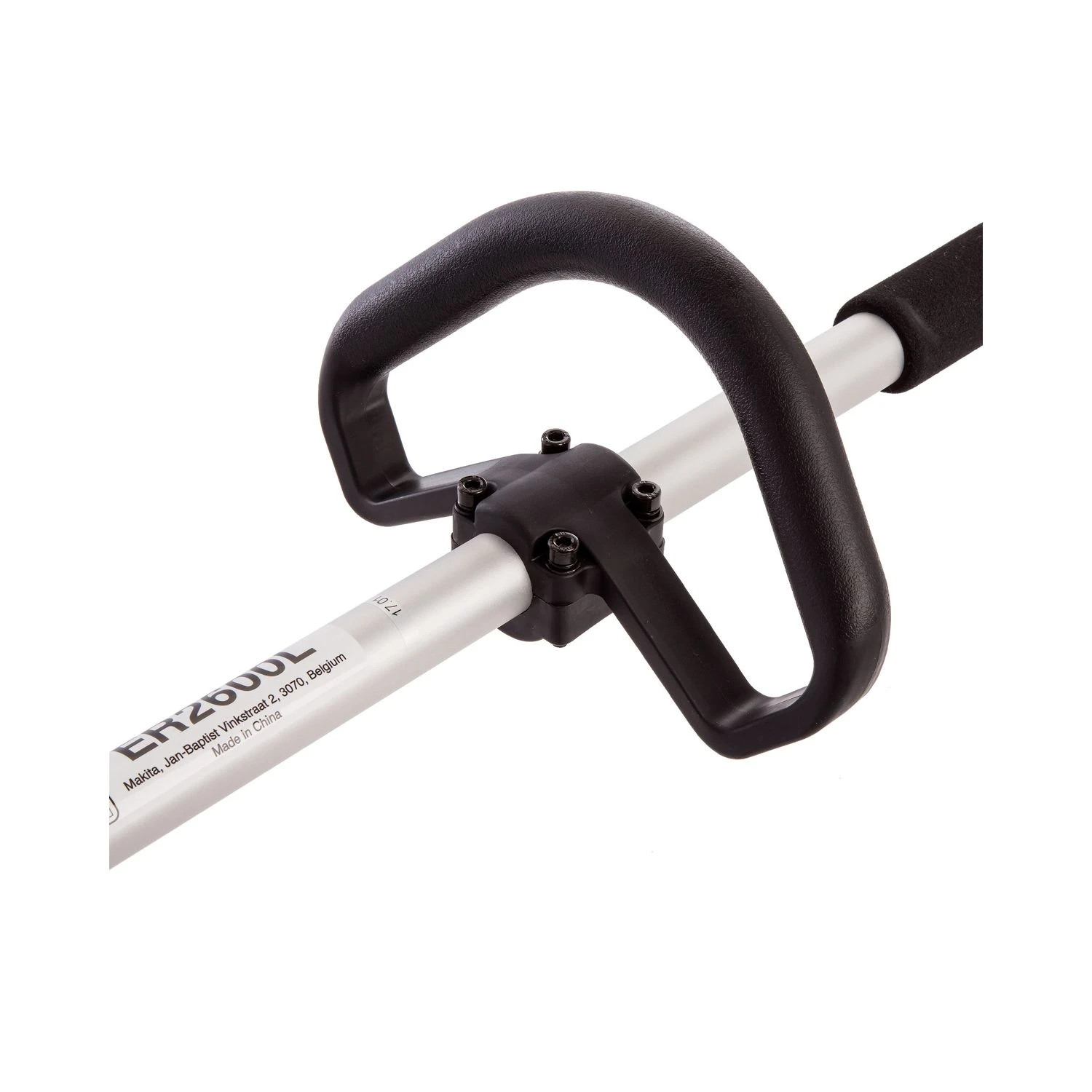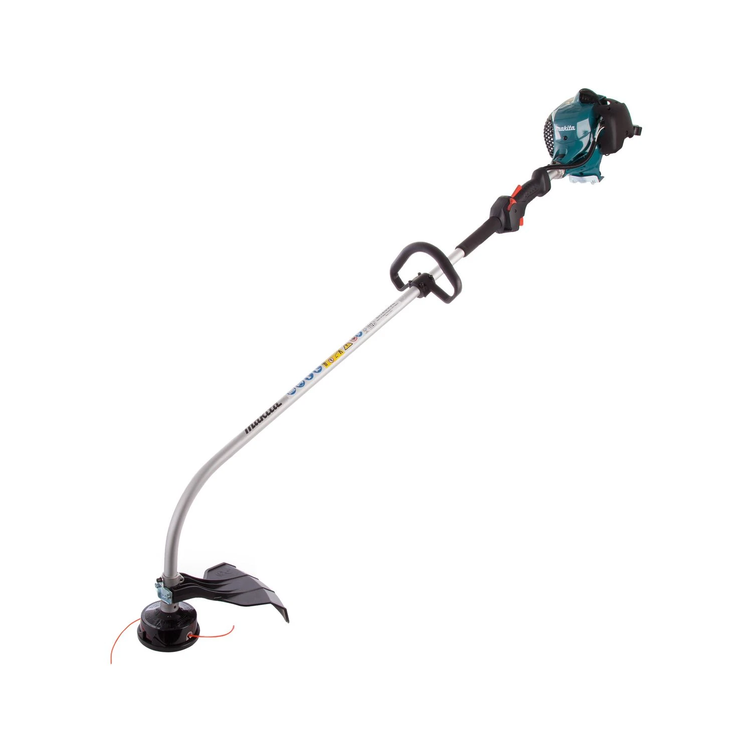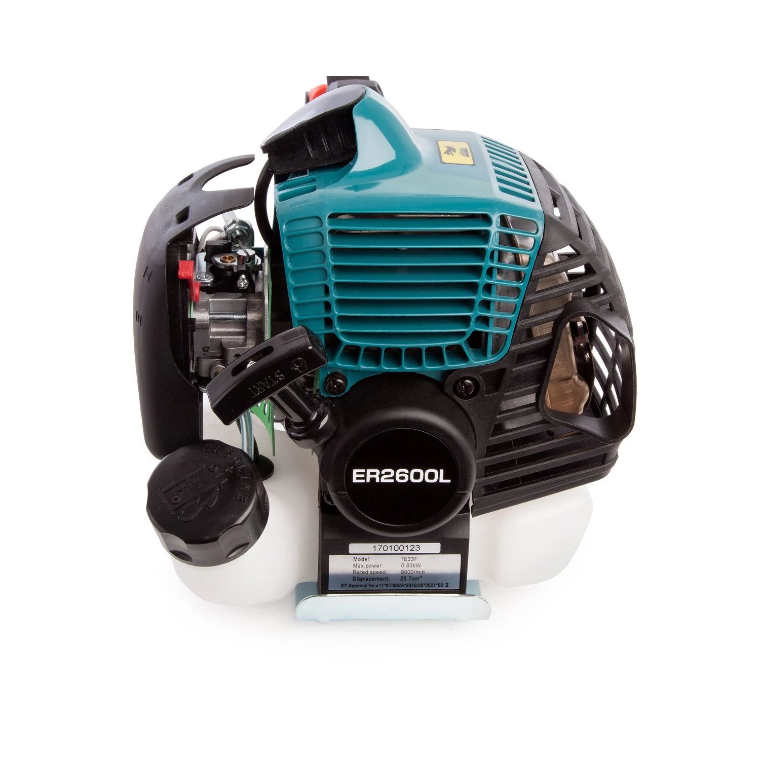 The Makita ER2600L is a bent shaft petrol string trimmer with a 25.7cc 2-stroke petrol engine that complies with EPA Phase 2 and EU Stage 2 exhaust emission regulations. It features a high power output and easy start engine plus a compact protector for better viewing of the cutting area without losing grass scattering prevention and has a twin line bump feed head with easy line refill. This unit is aimed at the domestic user with a large garden where electric trimmers are not suitable.
