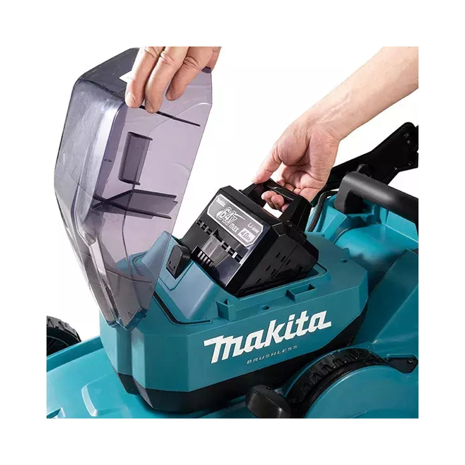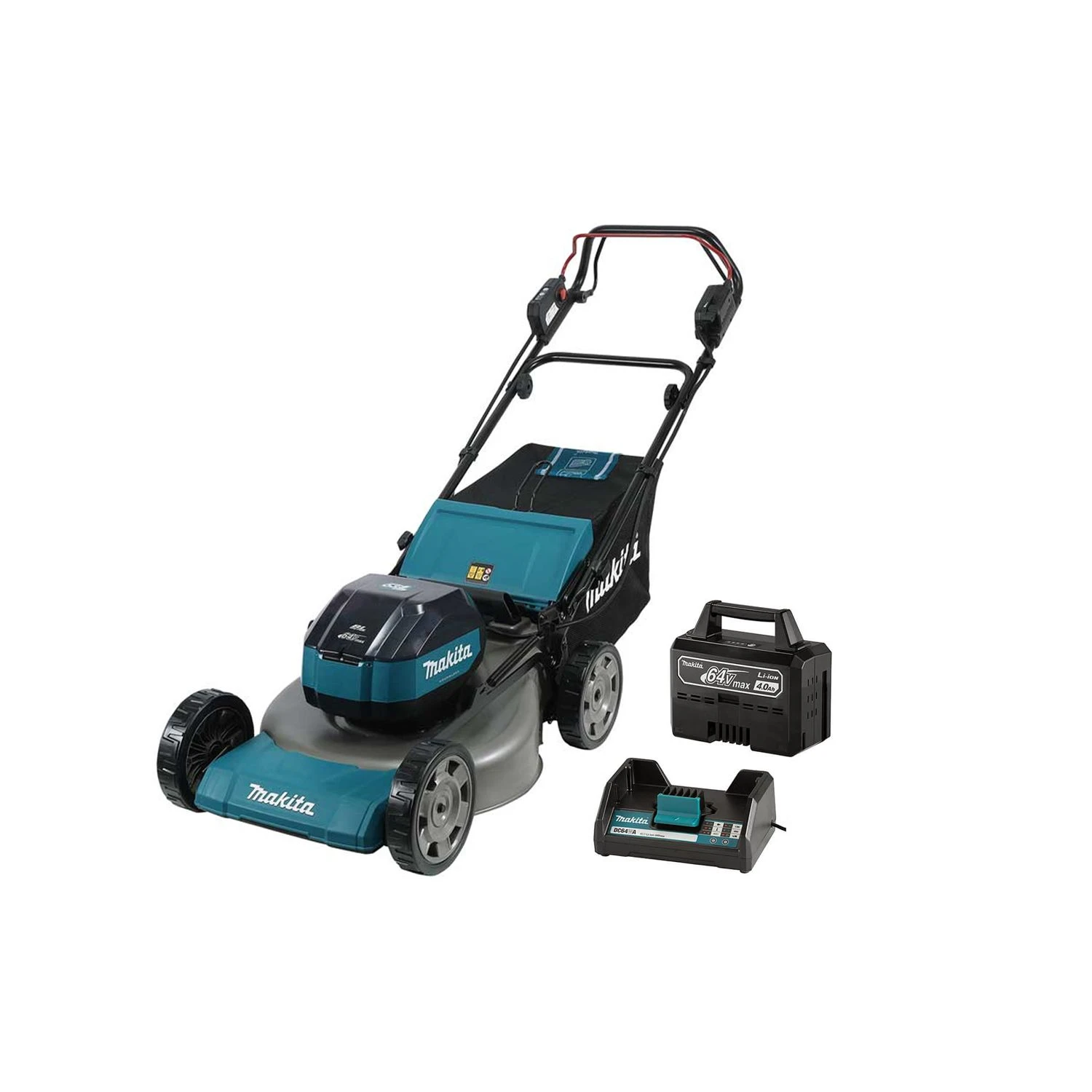 The Makita LM004JM101 64V 543mm Brushless Self-Propelled Lawnmower. For professional use by landscapers and gardeners this cordless mower will allow you to work quickly and effectively. The brushless motor gives it enhanced power and the 534mm cutting width provides a good area of coverage for use on large lawns and grounds. With a box capacity of 70 litres you will not have to empty it as often and by being cordless you have more freedom of movement. There are ten cutting height settings that range from 20mm to 100mm so you will be able to get the look you desire and its IPx4-rated water resistance allows you to work in wet weather. This lawnmower comes with an extremely powerful BL6440 64V battery so you can reap the benefits from this impressive machine.