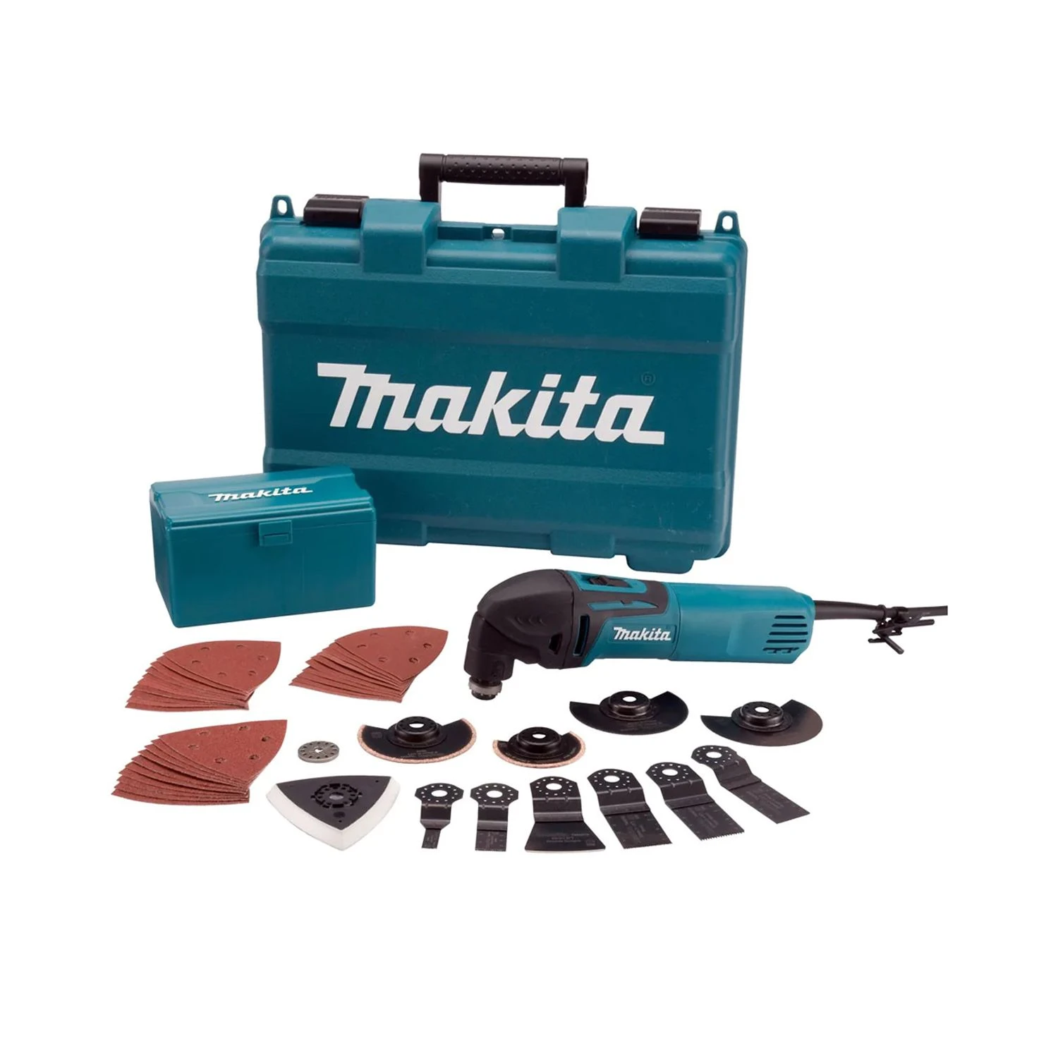 The Makita TM3000 Extra versatile oscillating multi-tool. Comes complete with a wide selection of accessories available for various applications. A real compact and diverse tool. With an oscillating rate of up 20,000 revs per minute the TM3000 will glide through even the toughest cutting jobs with ease. The soft start facility allows you to place the blade accurately on the workpiece and avoids the blade skipping around for a more precise cut. The blade can be attached in a variety of angles in 30 deg incriments for a full 360 degrees of optimum manoeuvrability. With this package you have the ability to sand, flush cut or deep cut woods, metal, nails and plastic, window putty, rubber, cut tiles and rout grouted joints between tiles, the possibilities are truly endless.