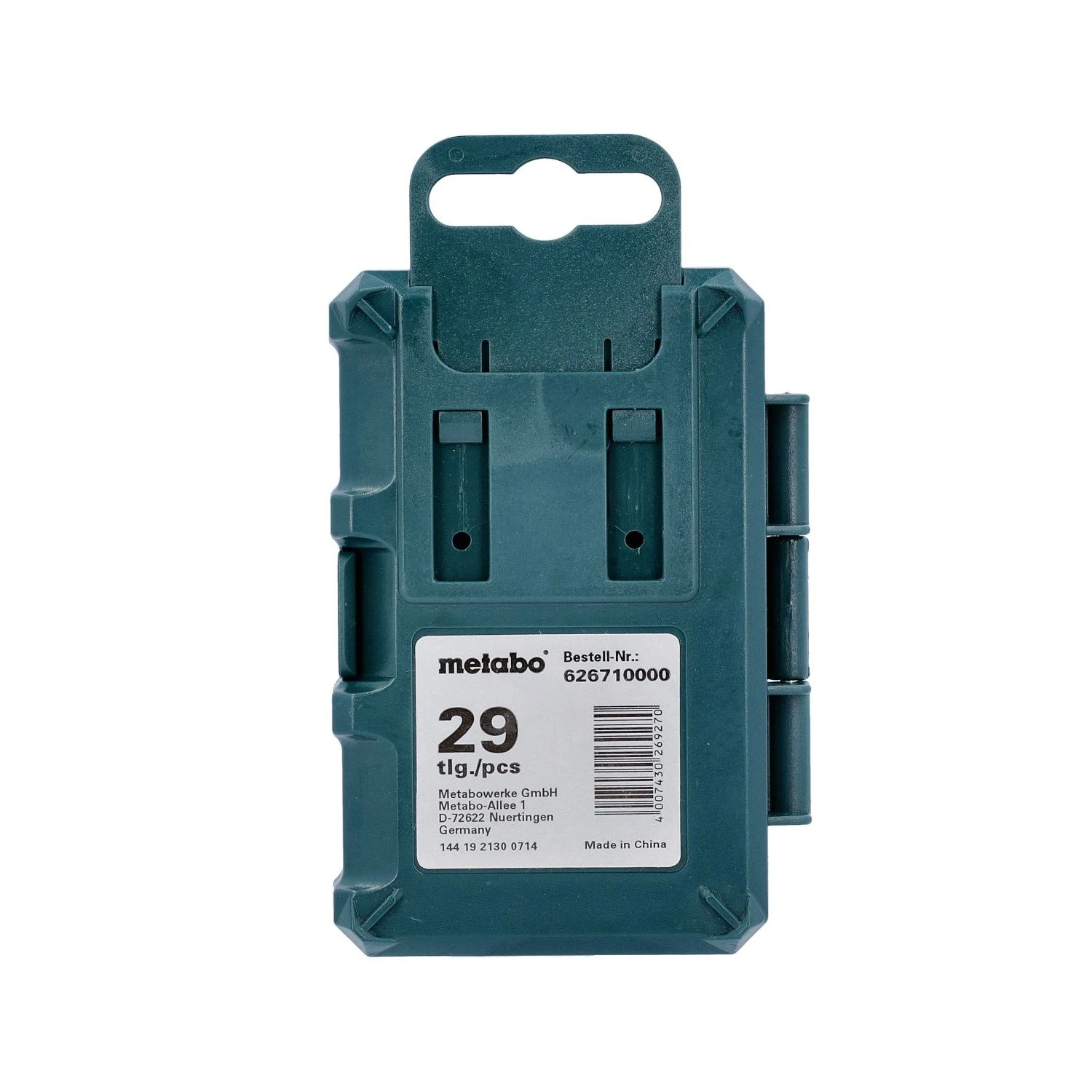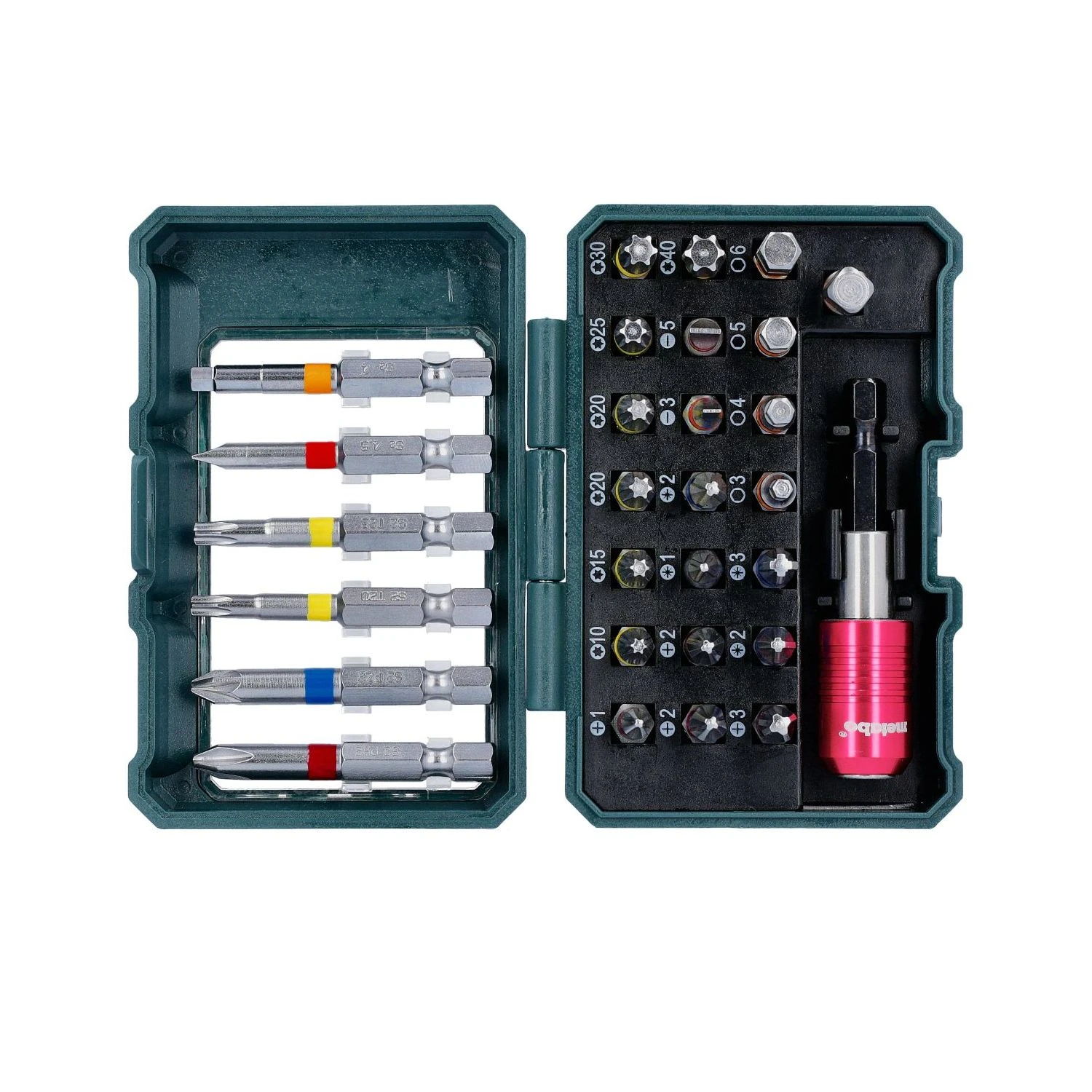 - Bits made from chrome vanadium steel (S2 quality); bits with colour coding: for quick finding of the right bit; magnetic quick change adapter; high-quality, robust box in special Metabo design with high-quality, robust box, with Euro hook tab