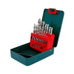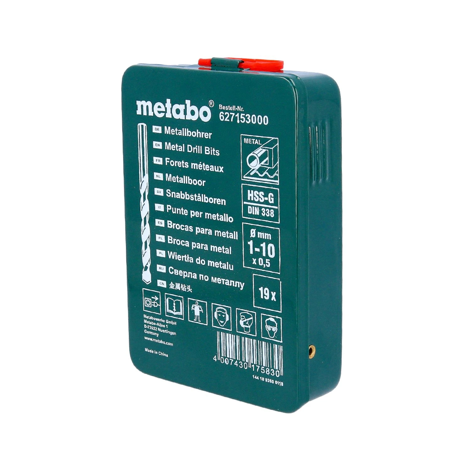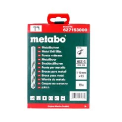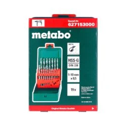 The Metabo HSS-G bit storage case 19-piece drill bits are drill bits for metal and are suitable for drilling into steel, VA-steel, cast steel, non-ferrous metals, plastics, special alloys; up to 1100 N/mm² tensile strength.