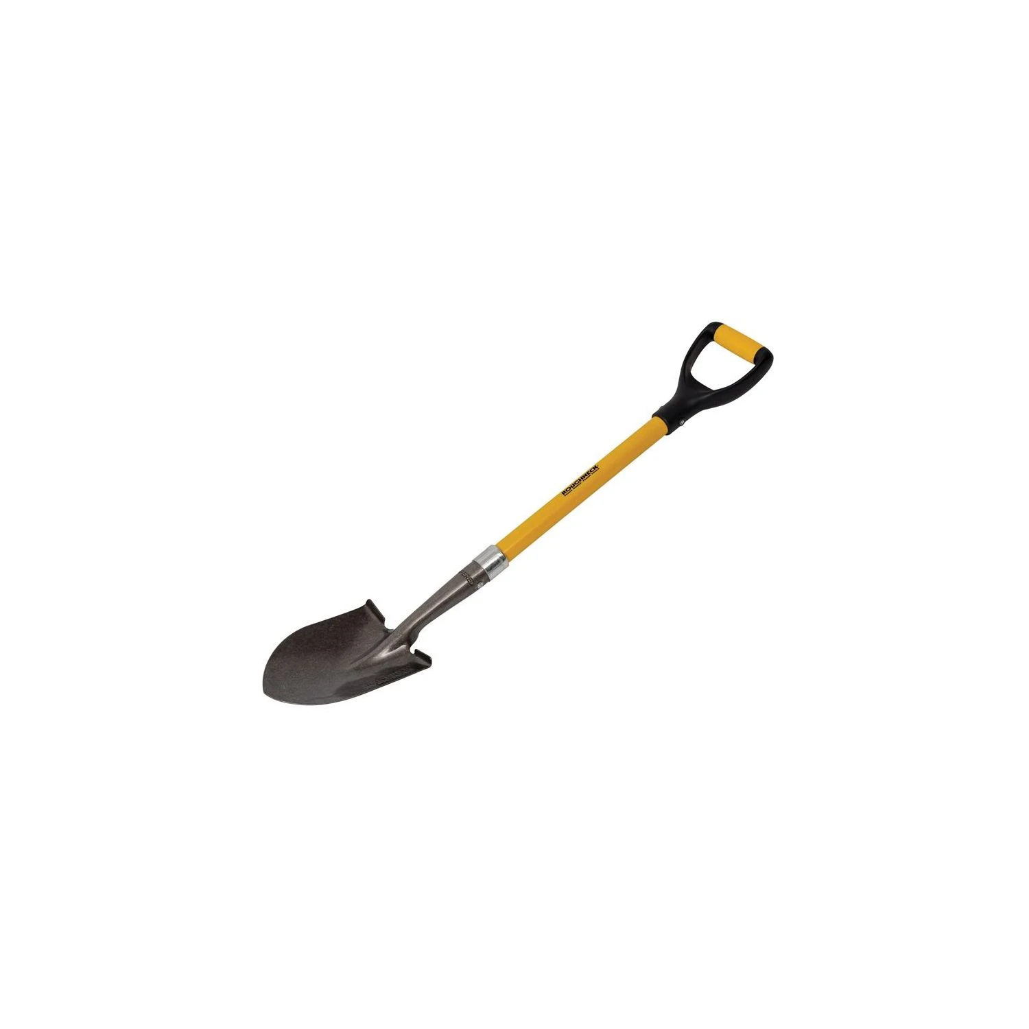 This Roughneck® Mini Shovel has a heavy-duty carbon steel blade with a round point. Perfect for digging and shovelling in confined spaces. Its steel reinforced Power Ring socket offers the strength of much larger shovels with the convenience of a shorter length shaft. With a lightweight, fibreglass shaft with a full-size double-injected D grip handle for comfort in use.