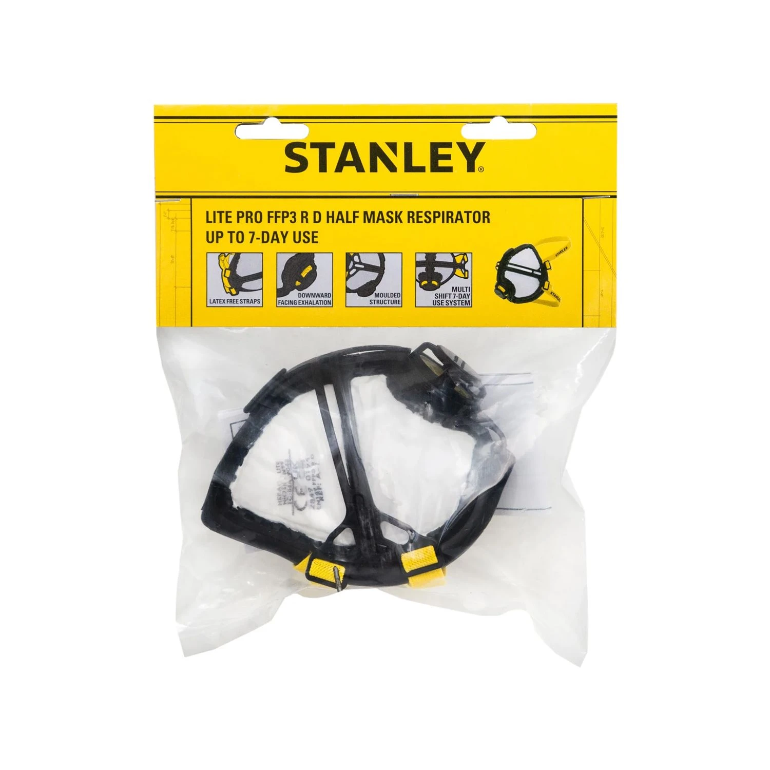 The STANLEY® FFP3 R D Lite Pro Dust Mask Respirator offers protection from dust, metal fumes, oil, water mists and micro-organisms. It has a fully elasticated strap for the ultimate face seal that offers an ultra-low breathing resistance using Hepac-lite ® filter technology. The multi shift respirator has a downward facing exhalation valve to prevent fogging of glasses.