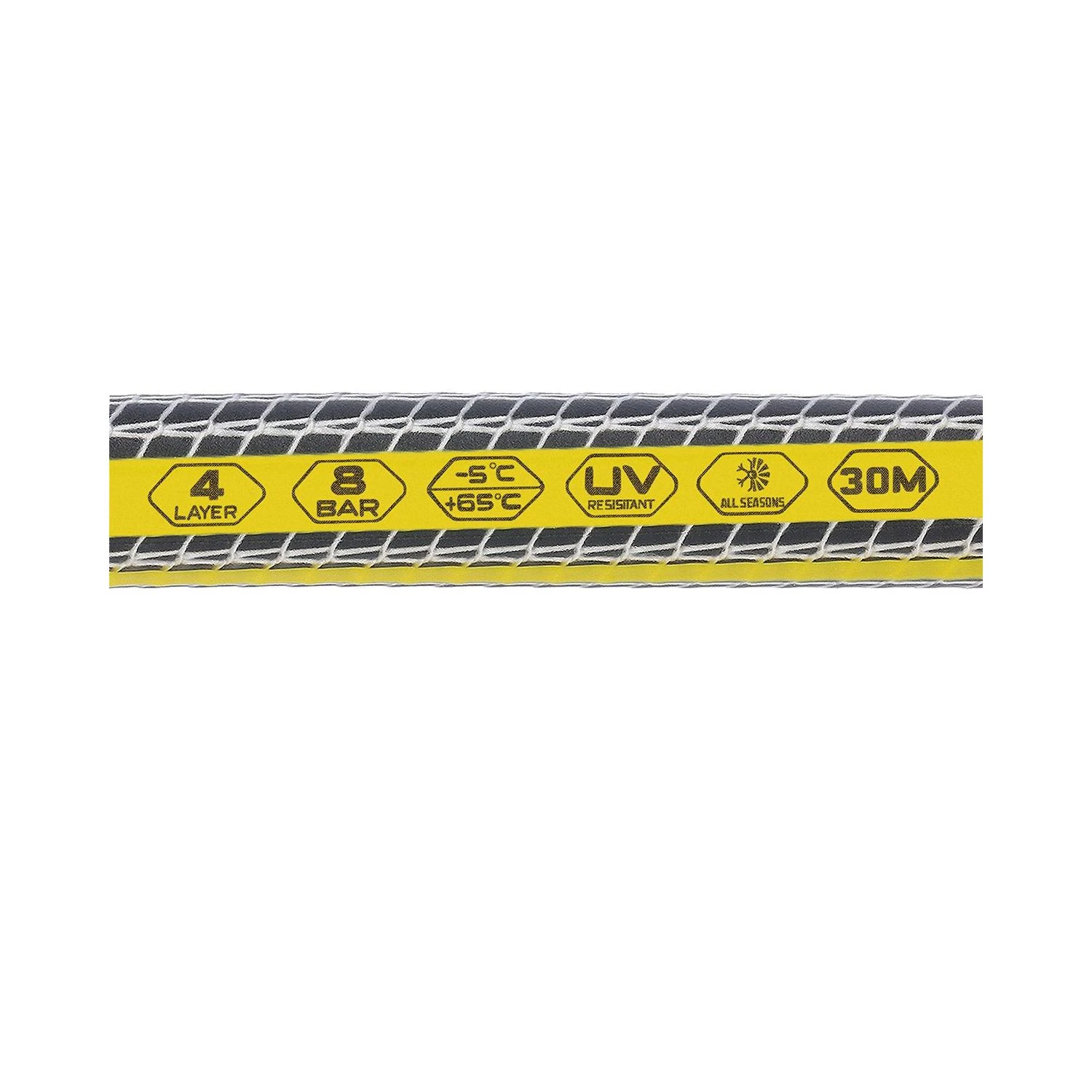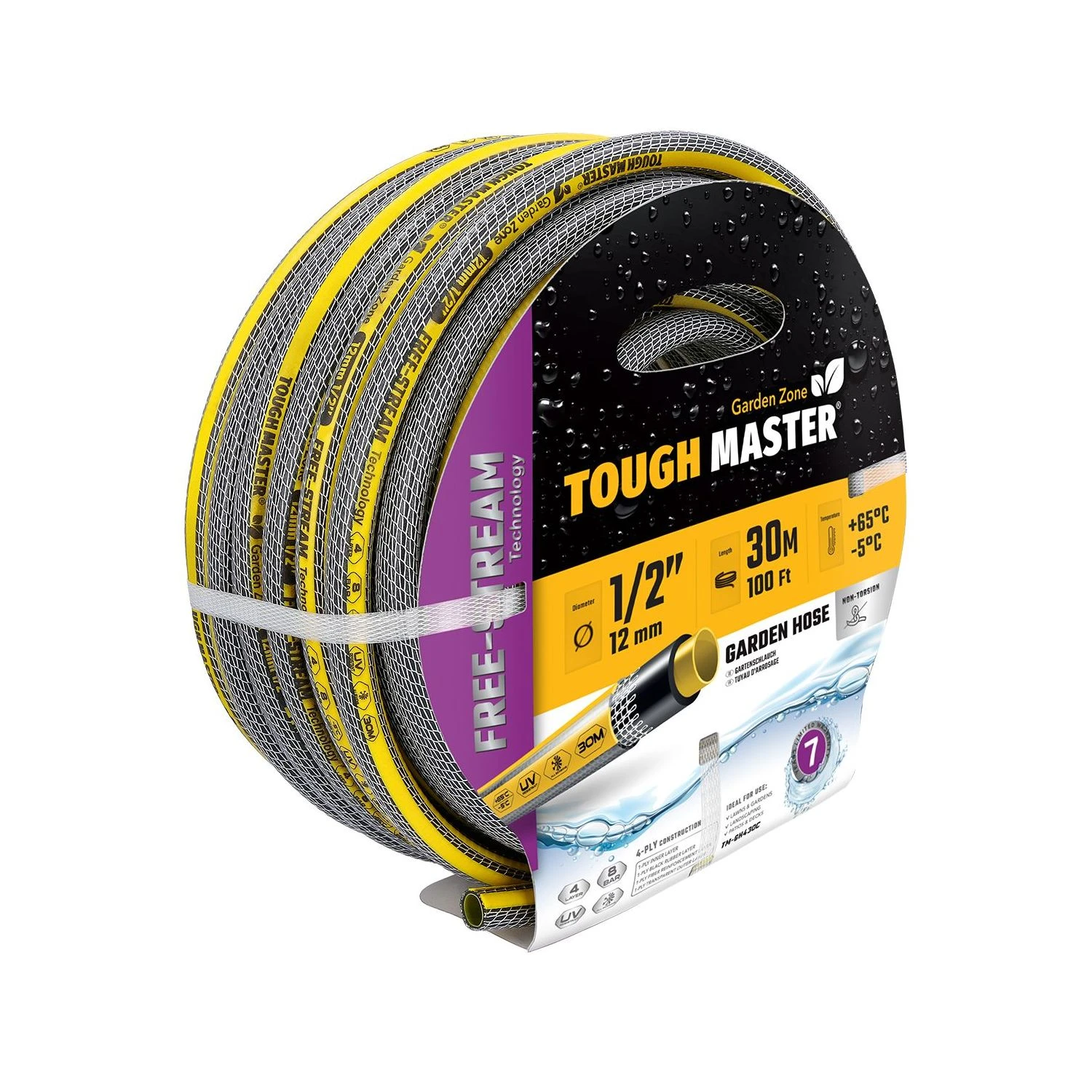 Our TOUGH MASTER® 30m Garden Hose is as durable as it is long. The TM-GH430C has 4 layers: 1 durable inner layer, 1 flexible rubber inner layer, 1 mesh reinforcement layer and 1 transparent outer layer. The mesh layer prevents kinks, bending and twists. The transparent outer layer resists UV radiation, algae and frost. It is also textured for a surer grip, even when wet. The hose has a wide temperature tolerance of 5°C to 65°C.