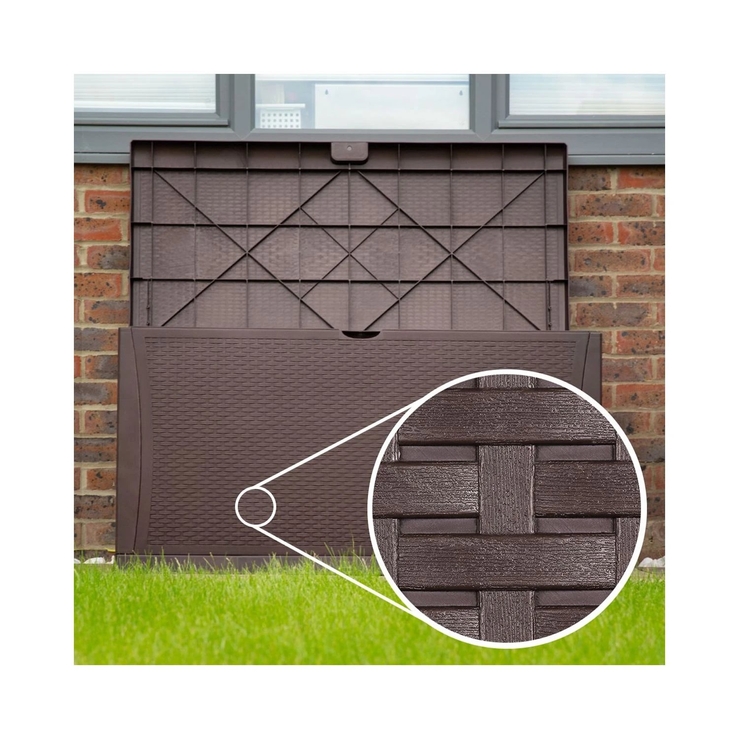 - Attractive design: The outdoor plastic storage shed is available in coffee-coloured polypropylene with an attractive weave-effect finish, adding a touch of style to any garden, patio, or pool setting.