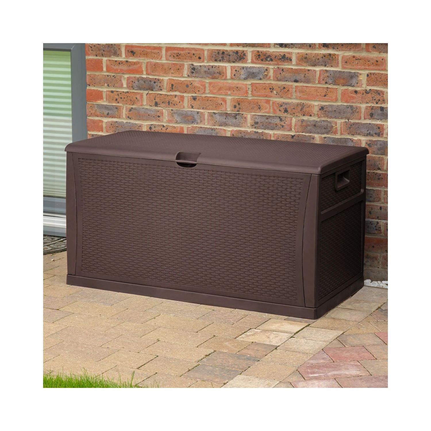 Help keep your outdoor space tidy and your outdoor belongings neat and secure with the TOUGH MASTER® TM-SBR46 Storage Box. This large 460-litre storage box is made from sturdy rattan-effect polypropylene that is both waterproof and weatherproof, and comes in an attractive shade of dark coffee brown. The TM-SBR46 also has a sturdy hinged lid with a latch to which you can add a lock for extra security. Two ergonomically designed side handles provide you with a comfortable, secure grip, so that you can easily move your storage box from one place to another. This storage box is easy to assemble – it takes minutes. It’s ideal for storing cushions, toys, gardening equipment etc., and is useful for balconies, patios, front or rear gardens.