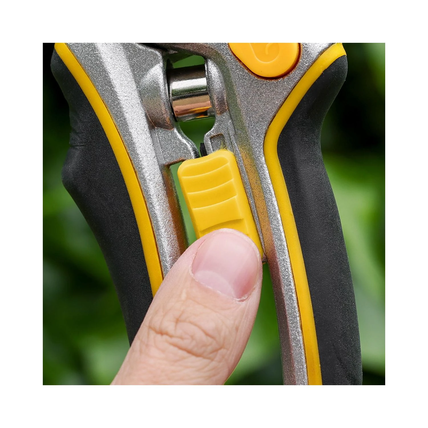 - Cutting-size adjustment: With just a quick flick of the switch, you can increase or reduce the grip width of the secateurs. This is particularly handy for smaller hands or when cutting thinner stems and branches, as it reduces unnecessary opening width, which in turn helps with hand fatigue.