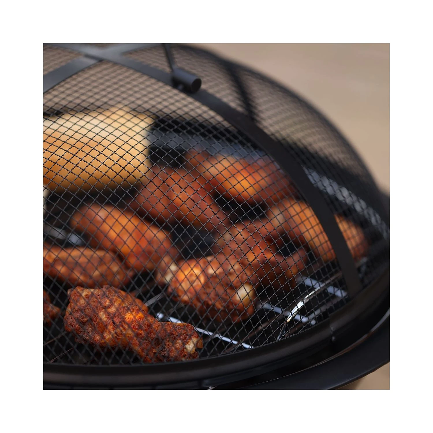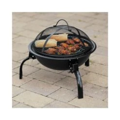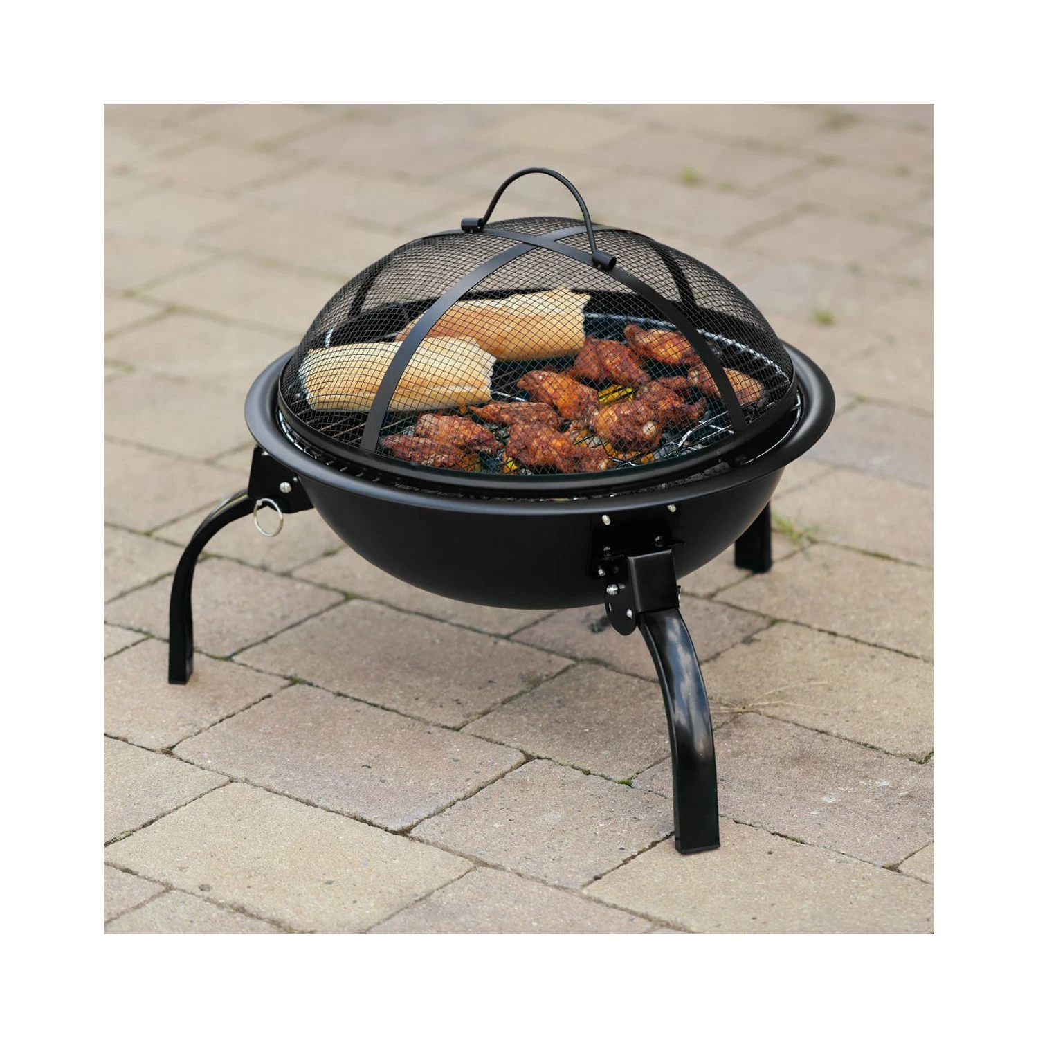 - Protective design: 3 sturdy, stable legs raise the BBQ’s fire bowl off the floor, preventing scorching and heat damage. The fire pit’s strong mesh cover protects your surroundings from sparks, embers and ash, too.