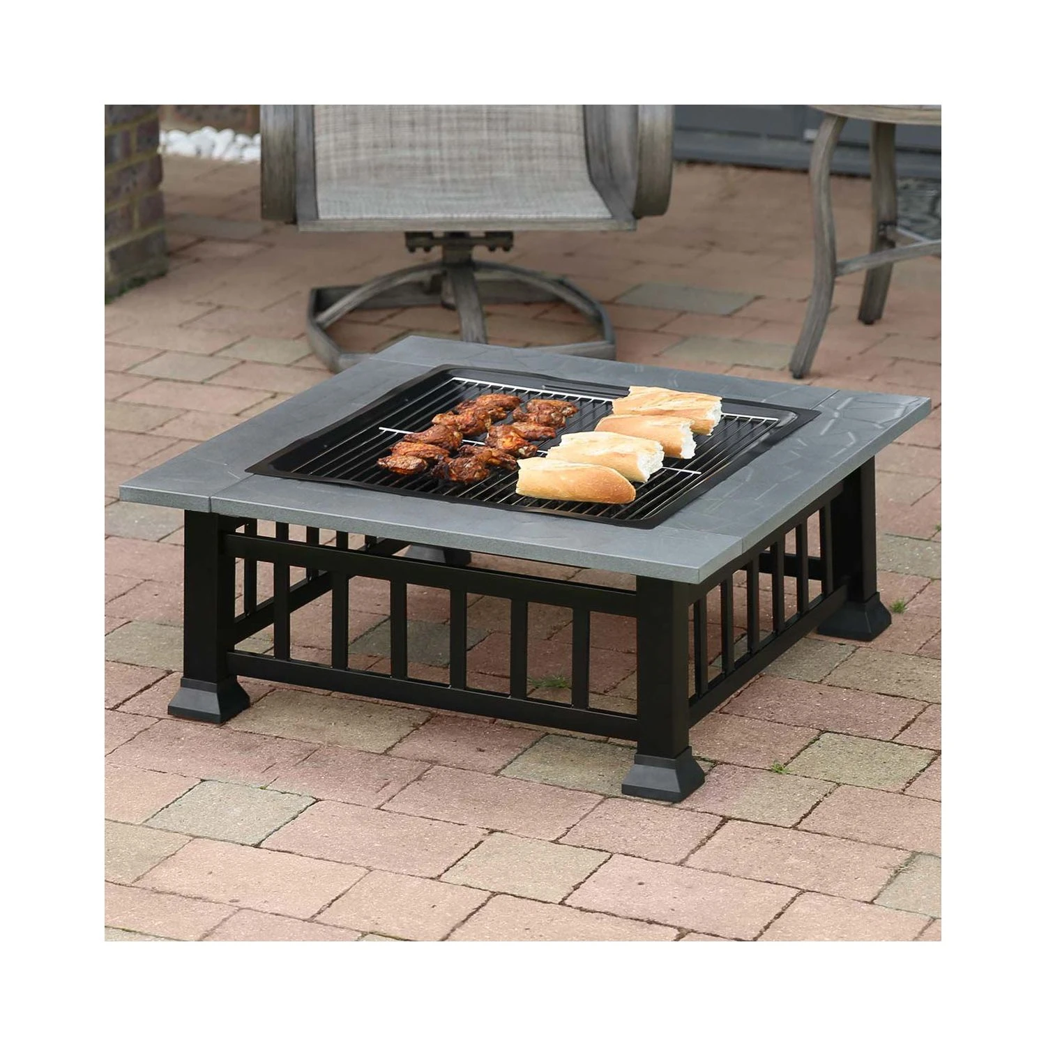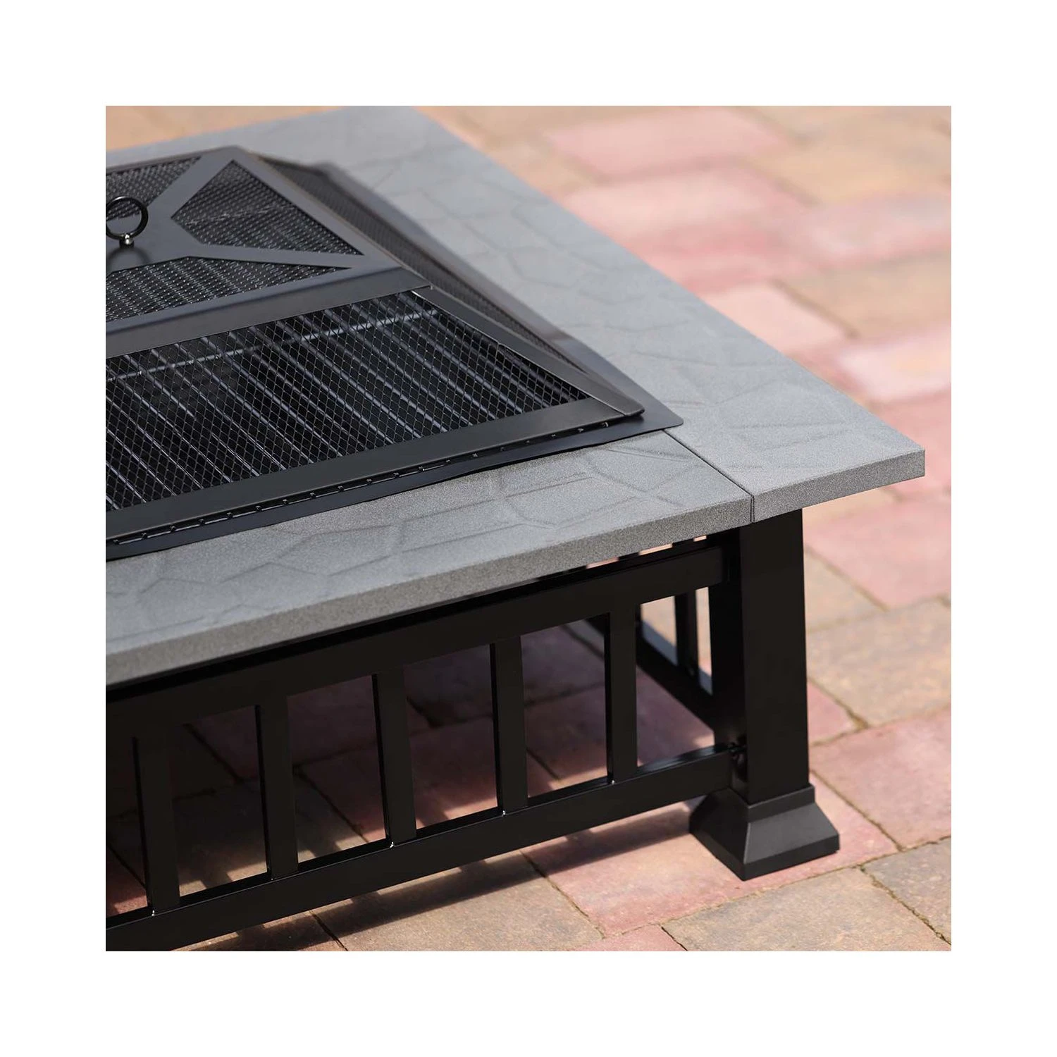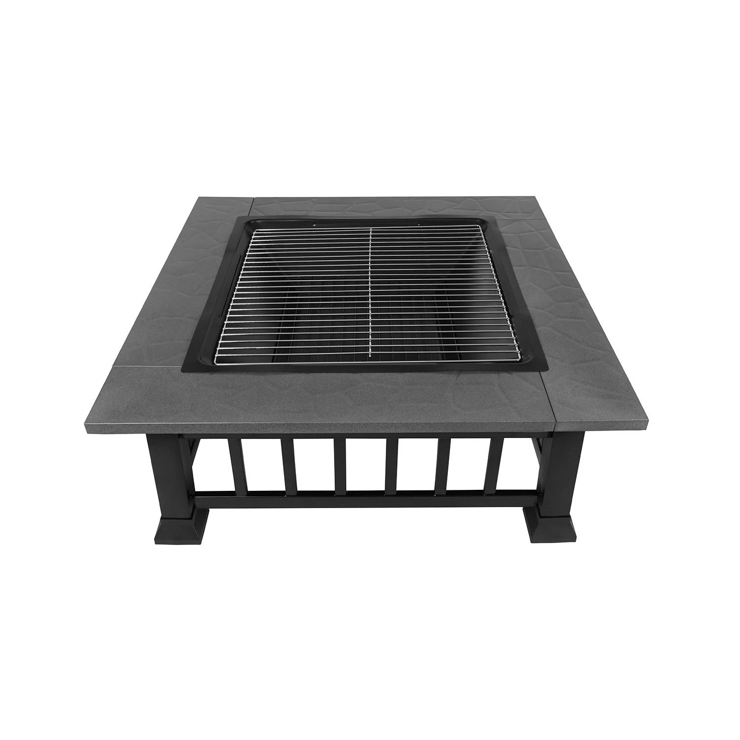 - Sturdy construction: It’s created from strong metal, and has a solid square frame, robust metal legs, a durable mesh cover, a chrome-plated steel BBQ grill and a solid steel fire grate. The frame’s black heat-resistant finish also resists rust and corrosion, while the firepit’s wrap-around outer shelf has a rust-resistant finish.