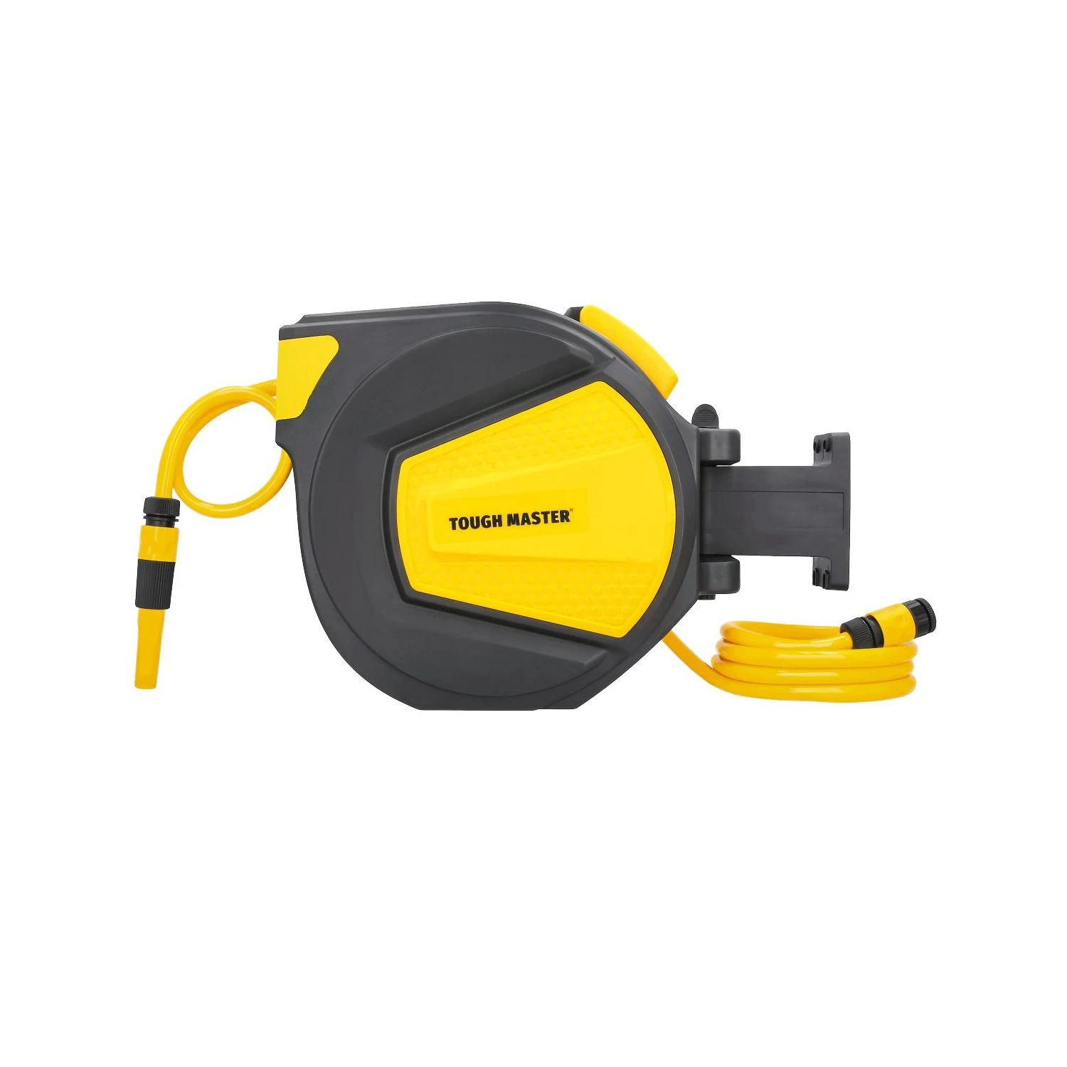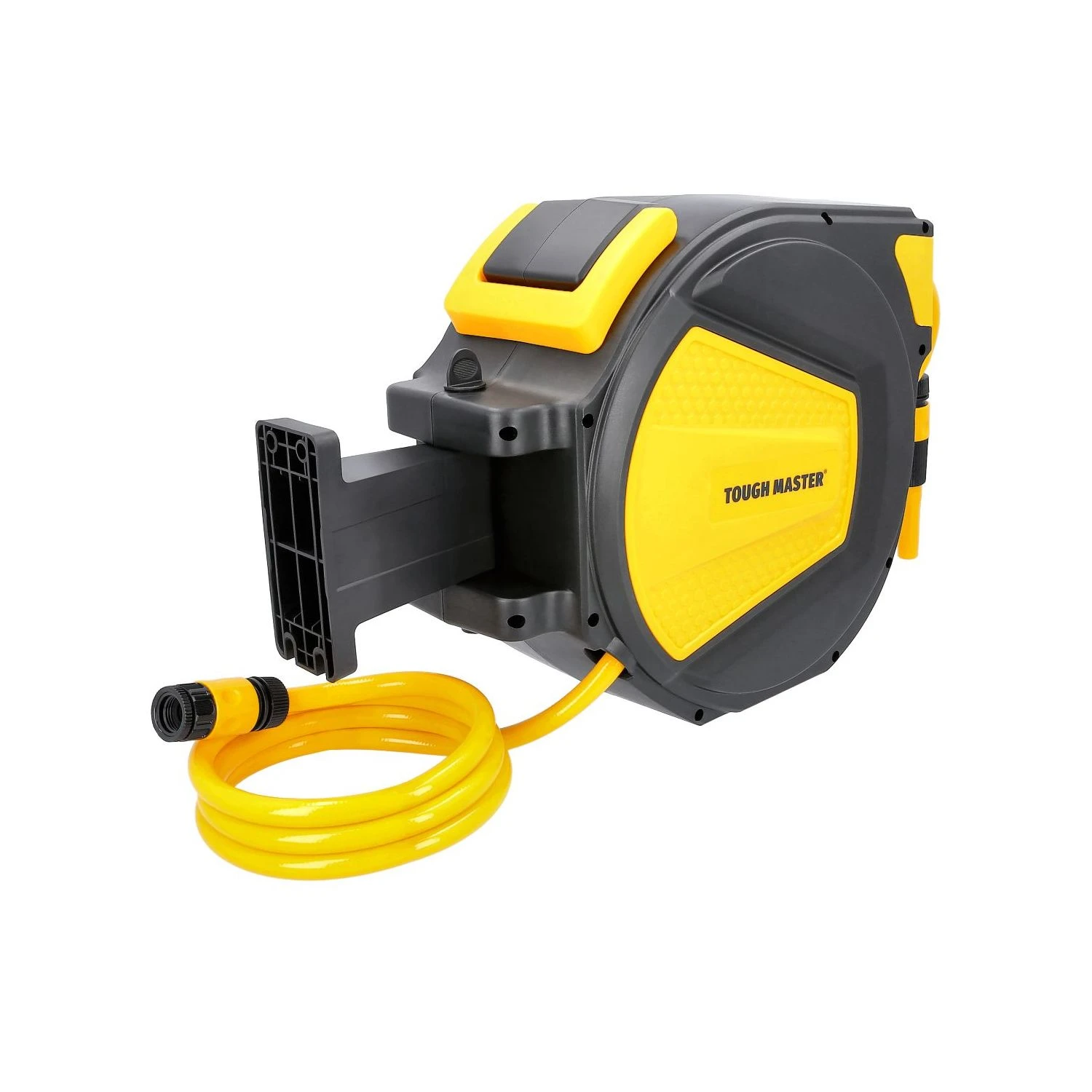 The TOUGH MASTER® TM-HRA22M Retractable Hose Reel is perfect for garden, yard, and car maintenance. This handy water hose reel has an automatic slow rewind system with an effective brake mechanism to ensure safe and reliable hose winding, increasing the retraction time to 7-10 seconds. It can fit firmly onto the wall thanks to its 180°pivot wall bracket system, which is easy to install and removable for situations where you need to store the hose reel cart elsewhere. Pre-installed with a 20m hose, you can lock the hose pipe reel at any length depending on your task, so you won’t have the full hose dragging behind you as you water your plants. Using less of the hose means it’ll retract quicker, too, giving you more time in the day to tend to other gardening needs. What’s more, the shell of the 20m garden hose reel is made entirely from polypropylene plastic, a material that is not only durable and UV-resistant, but recyclable too; so you can be confident you are making a planet-friendly purchase that is built to last. Meanwhile, the hose bumper on the hose pipe reel is designed to prevent the end of the hose from retracting into the hose reel case, while the integrated hose guide ensures smooth retraction without twists and tangles. With an ergonomically shaped carrying handle, relocate the wall mounted hose reel to the garage, shed, car, etc. comfortably and with ease.