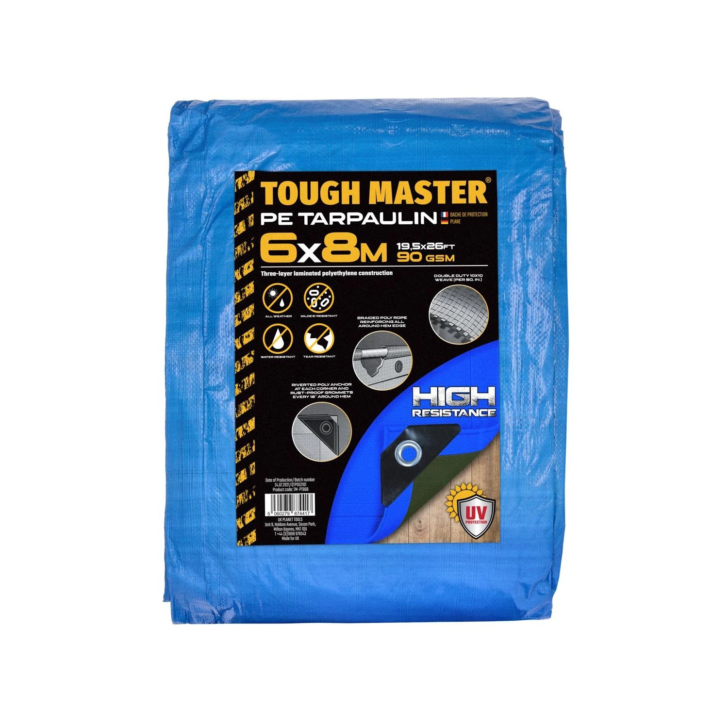- Durable fabric: This large tarpaulin from TOUGH MASTER® is created from 90 grams of woven polyethylene fabric per square metre that’s a full 10×10 fibre strands per square inch. The triple laminated construction means that this water resistant tarpaulin is extra durable.