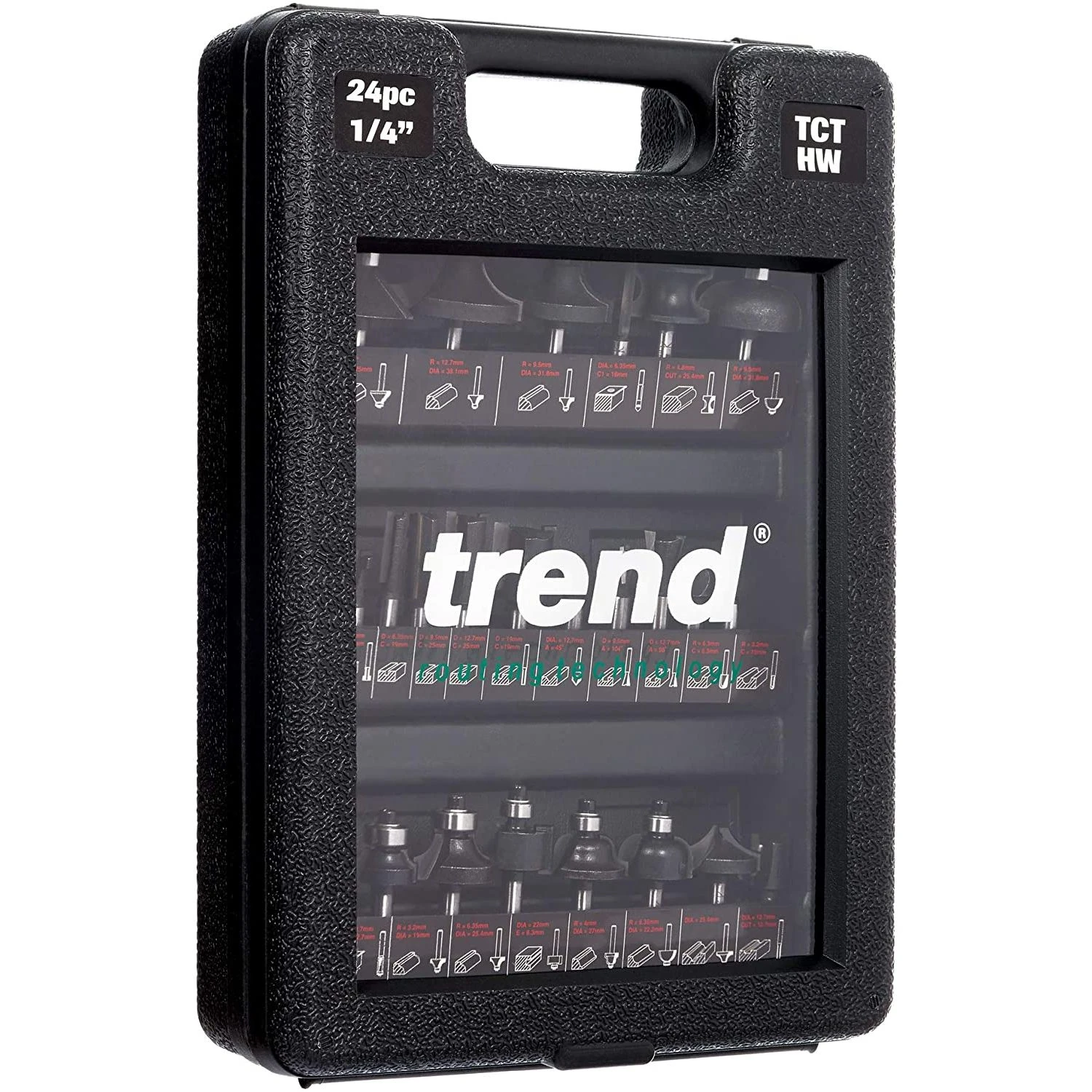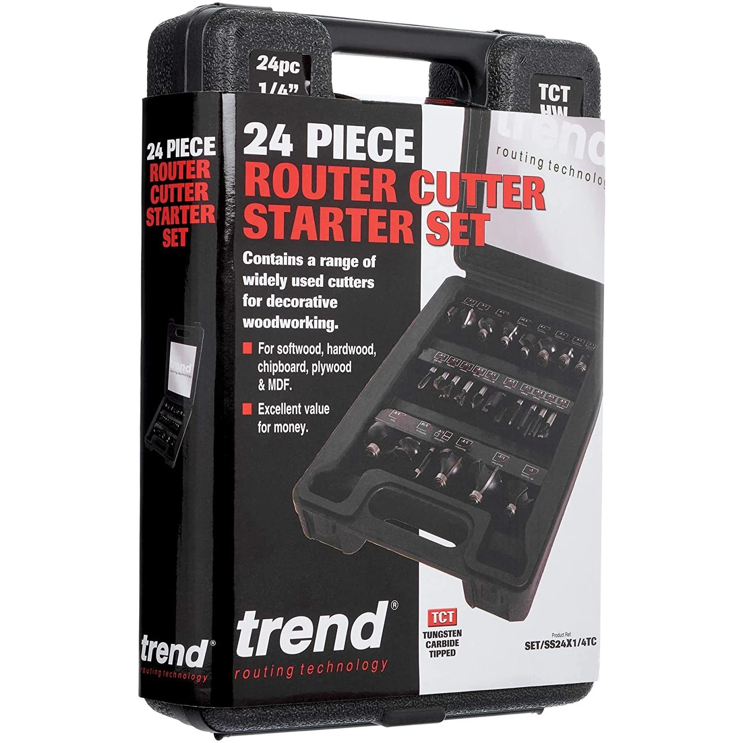 This twenty four piece cutter set contains a range of popular tungsten carbide tipped cutters for a variety of applications.1/4-inch Shank diameter.For softwood, hardwood, chipboard, plywood and MDF.Excellent value for money.Supplied in plastic carry case.