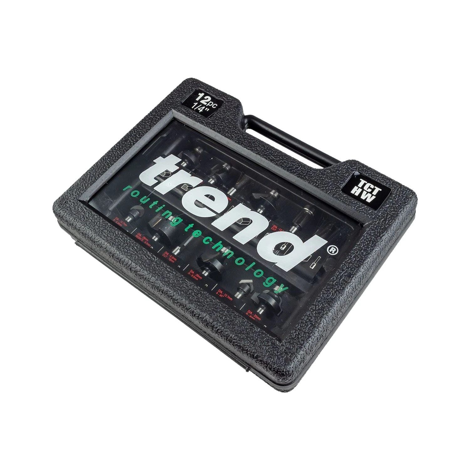 Trend 12 Piece Router Bit Starter Set contains a range of the most widely used cutters for decorative woodworking. Made from tungsten carbide with 1/4in shanks and supplied in a plastic carry case.