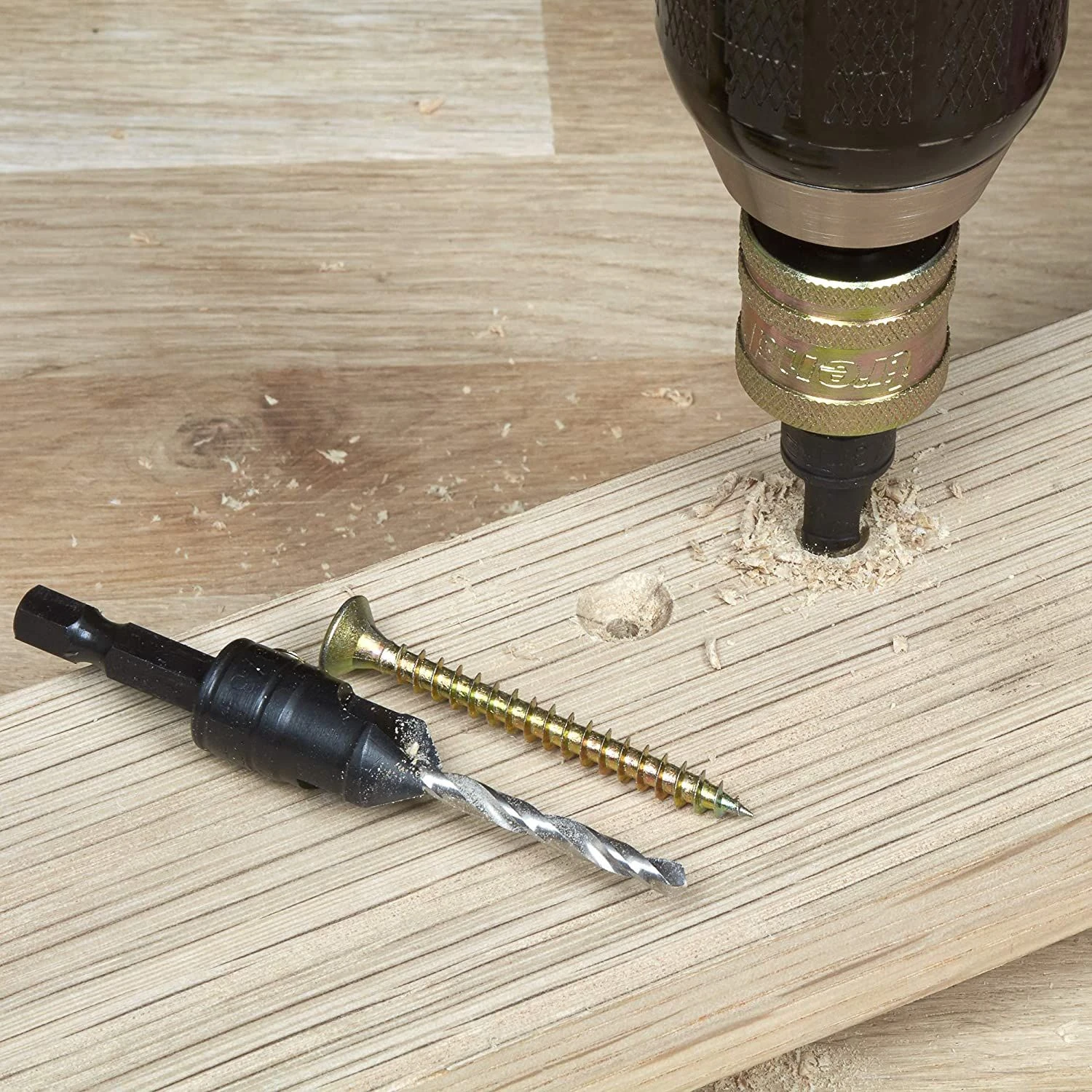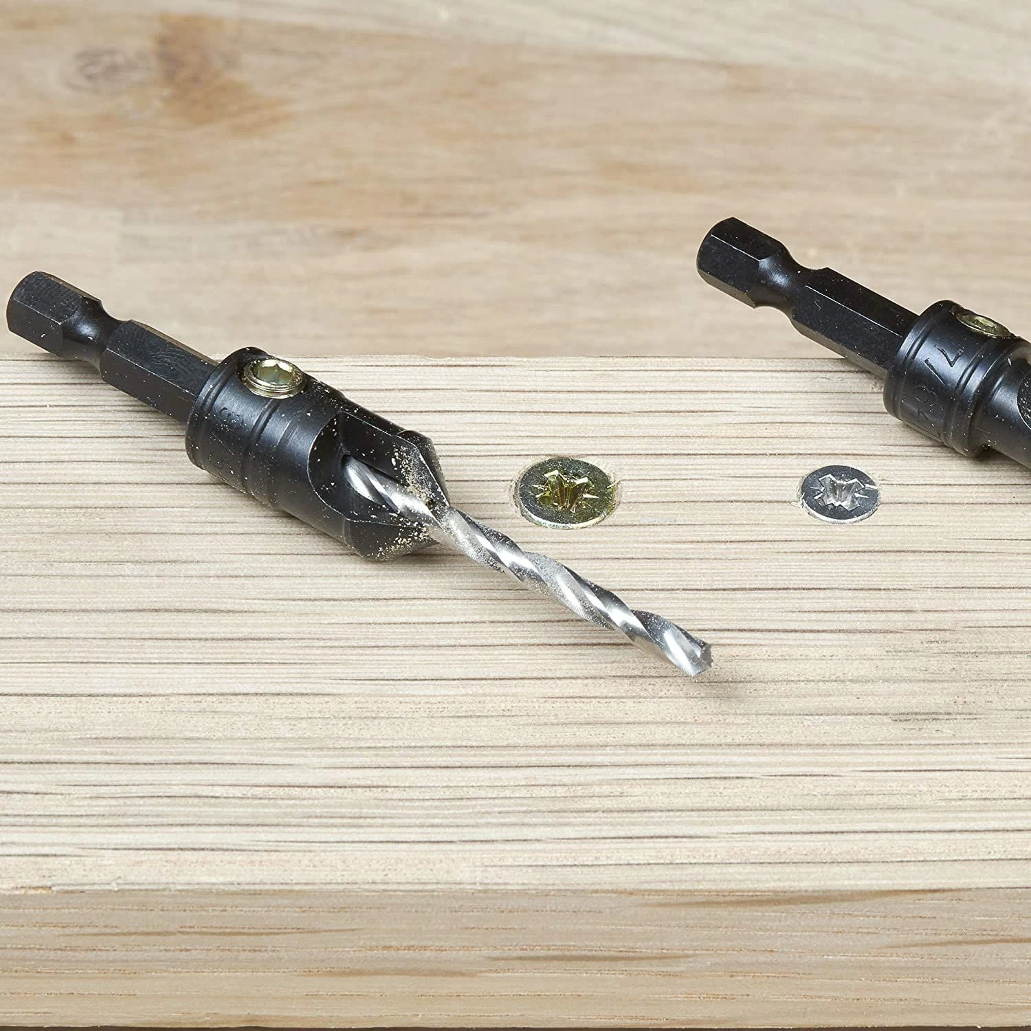 The Trend Countersink Set contains five heat treated tool steel countersinks with hex shafts. They are fitted with High Speed Steel drill bits to cover the full range of screw sizes and are self clearing. They are adjustable for different length screws and will produce a 9.5mm (3/8in) or 12.7mm (1/2in) diameter counterbored hole to fit standard woodplugs. Contains: 1 x 2.0mm (5/64in) Drill and C/S Size No.4.1 x 2.4mm (3/32in) Drill and C/S Size No.6.1 x 2.8mm (7/64in) Drill and C/S Size. No.8.1 x 3.2mm (1/8in) Drill and C/S Size. No.10.1 x 3.6mm (9/64in) Drill and C/S Size. No.12.Fitted with High Speed Steel drill bits to cover the full range of screw sizes and are self clearing. SNAP/CS/SET 5 Piece Countersink Set