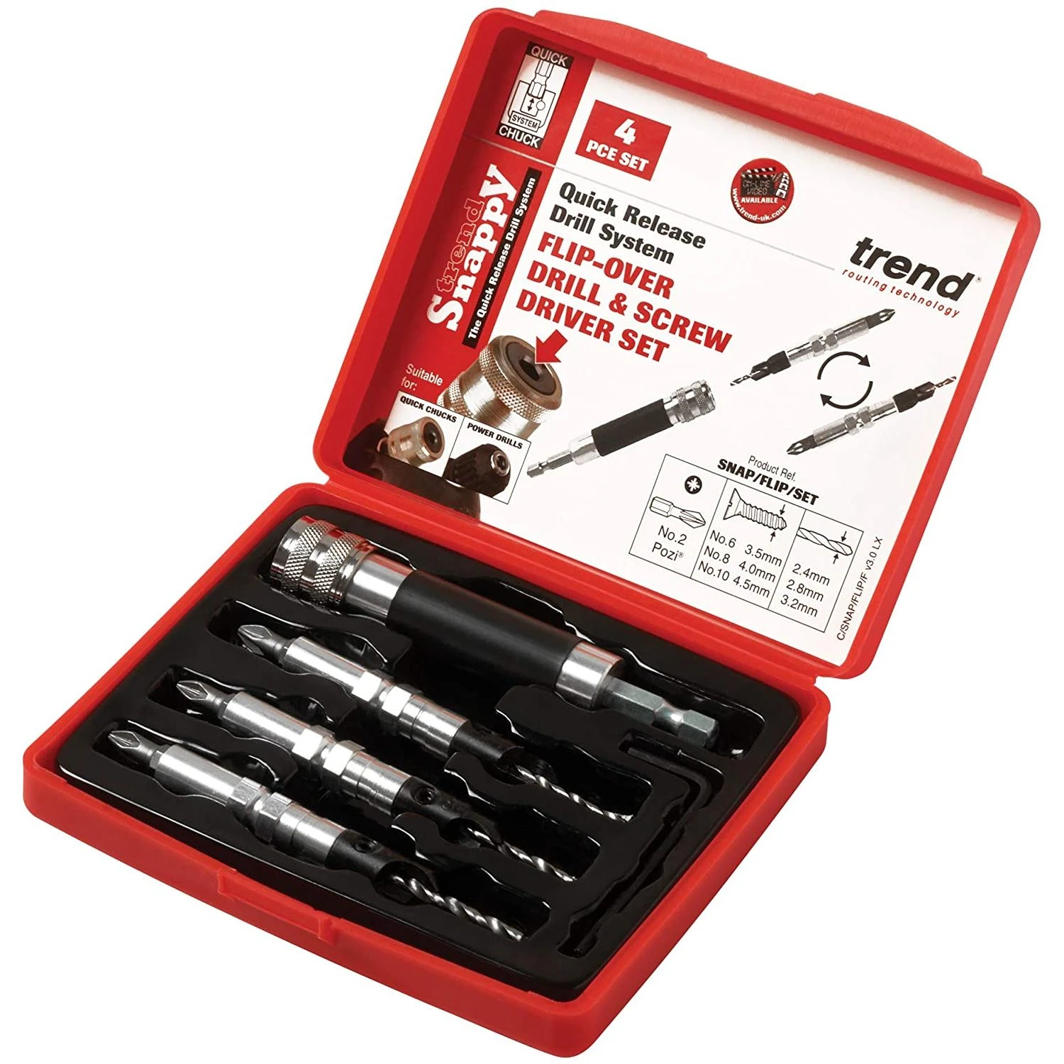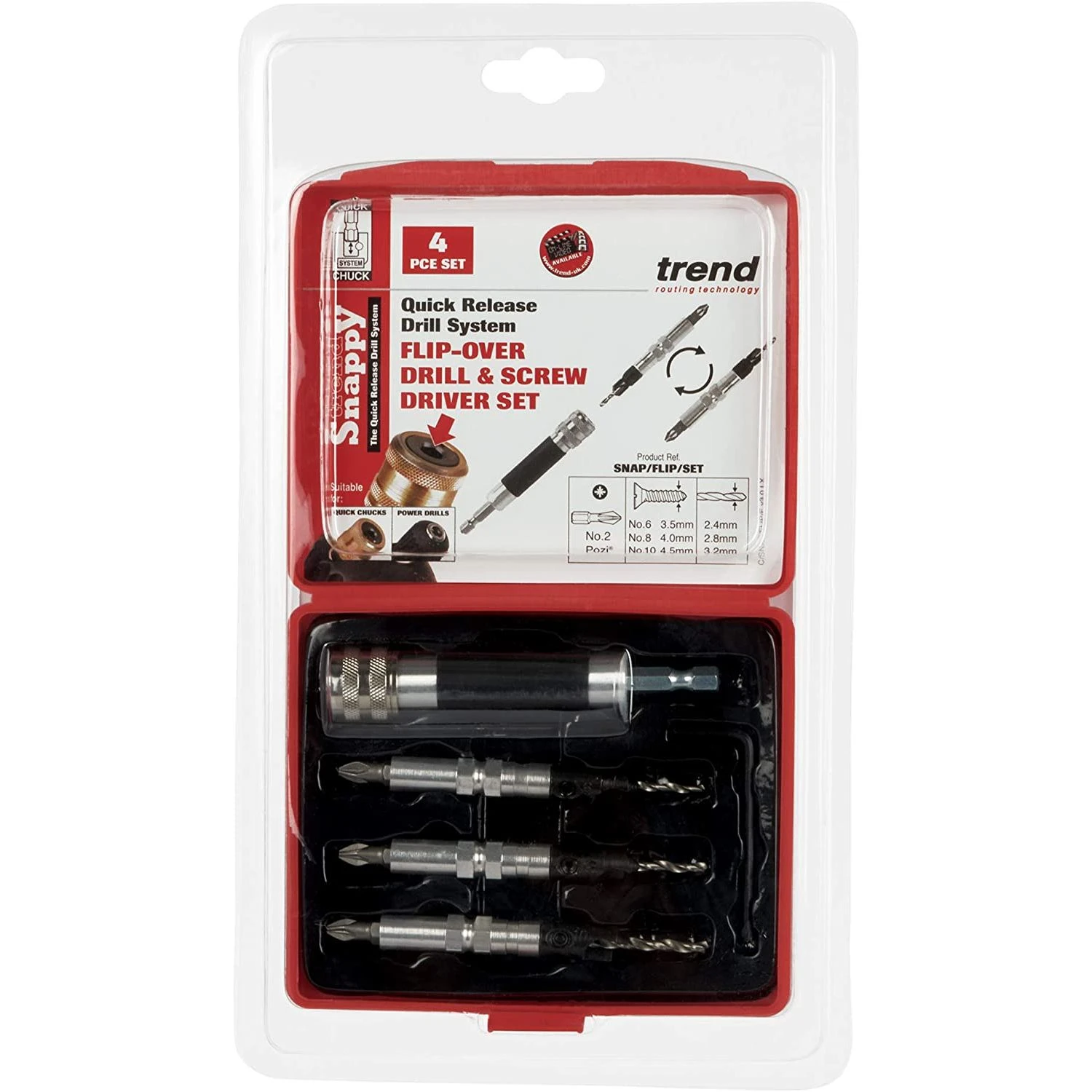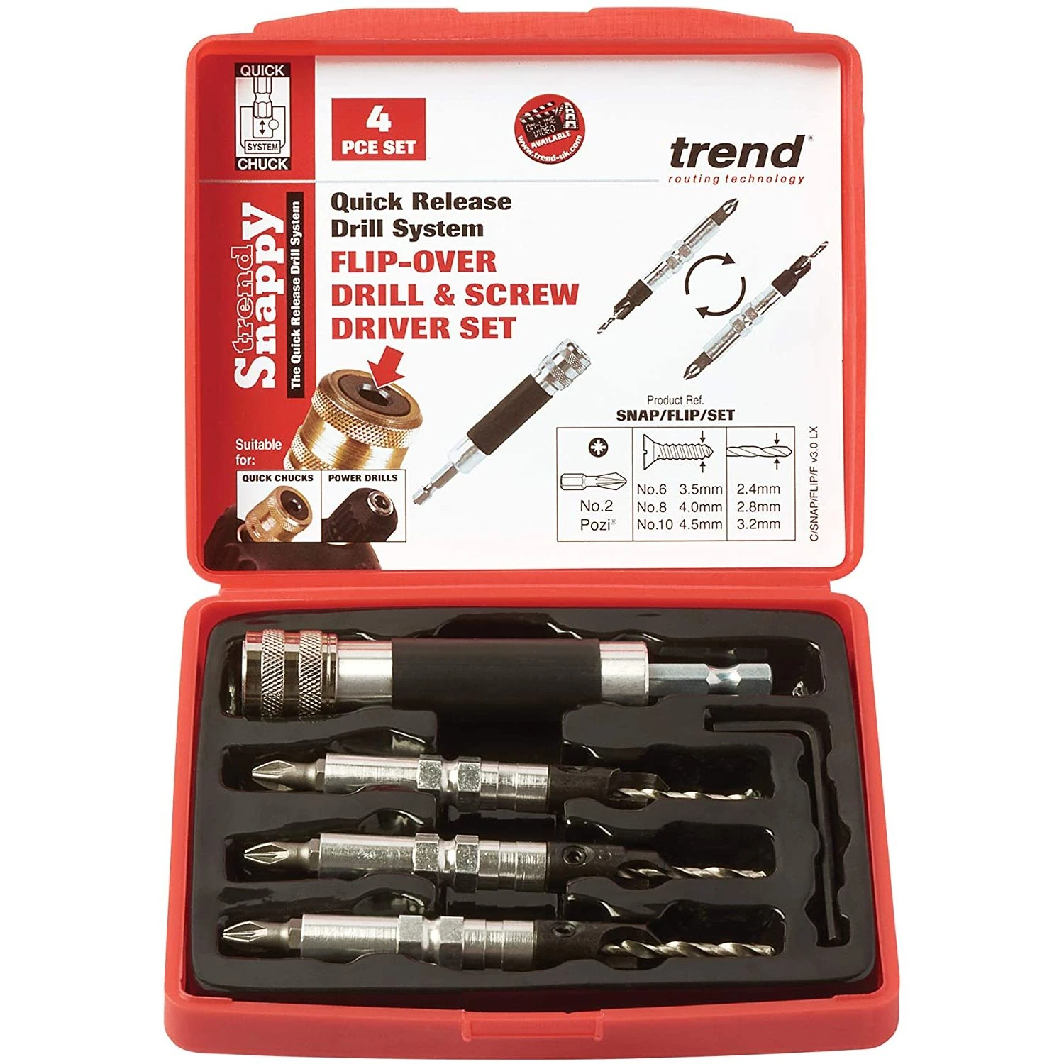 A four piece drill countersinking and screwdriving flip over set. Supplied with quick-change shank for fitting into Trend snappy quick chuck.Drill length can be adjusted with 5/64inch a/F hex key and is supplied with No 2 Pozi¬ drive Insert bits.