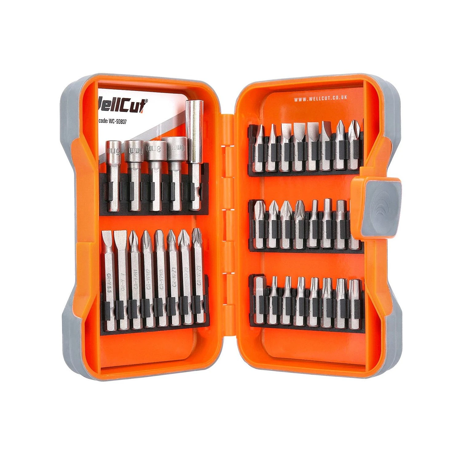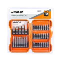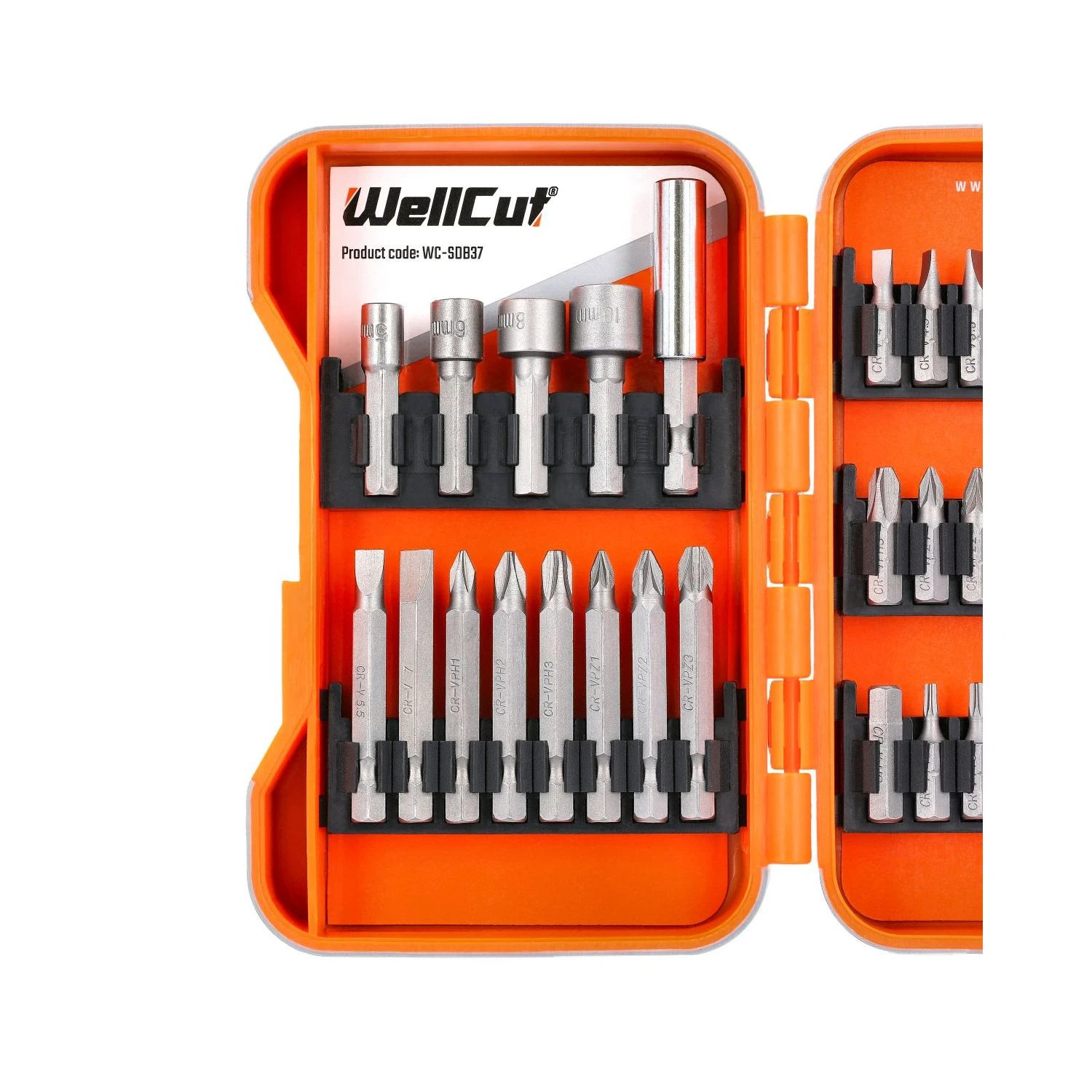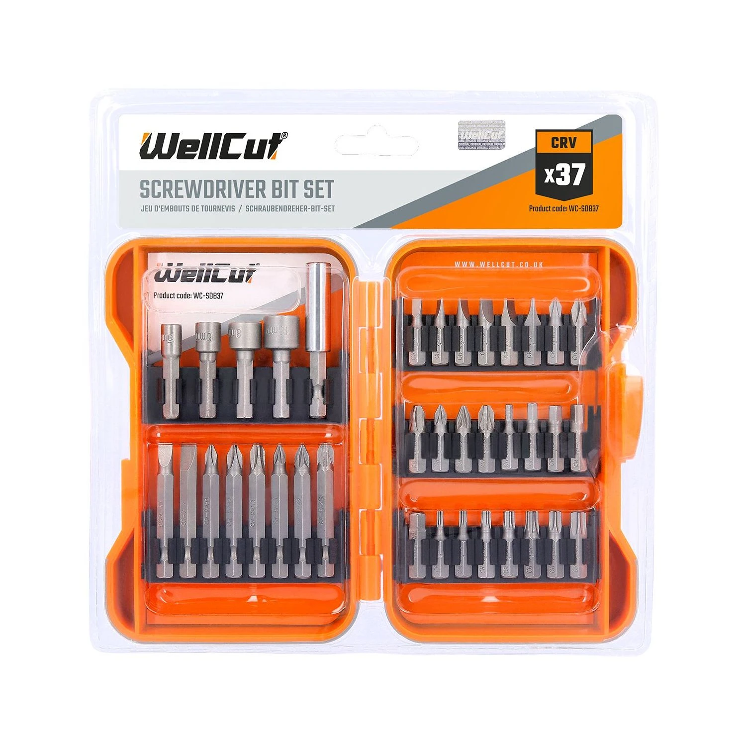 The WellCut 37 Piece Screwdriver Bits Set comes complete with a range of bit types from nut drivers, phillips, pozidriv and slotted components. A handy magnetic bits holder comes useful for interchanging bits between impact drivers. High quality storage case with safety latch included. Built from high quality fortified S2 Steel ensuring a solid build. Hardened rating at: CRV-6150.