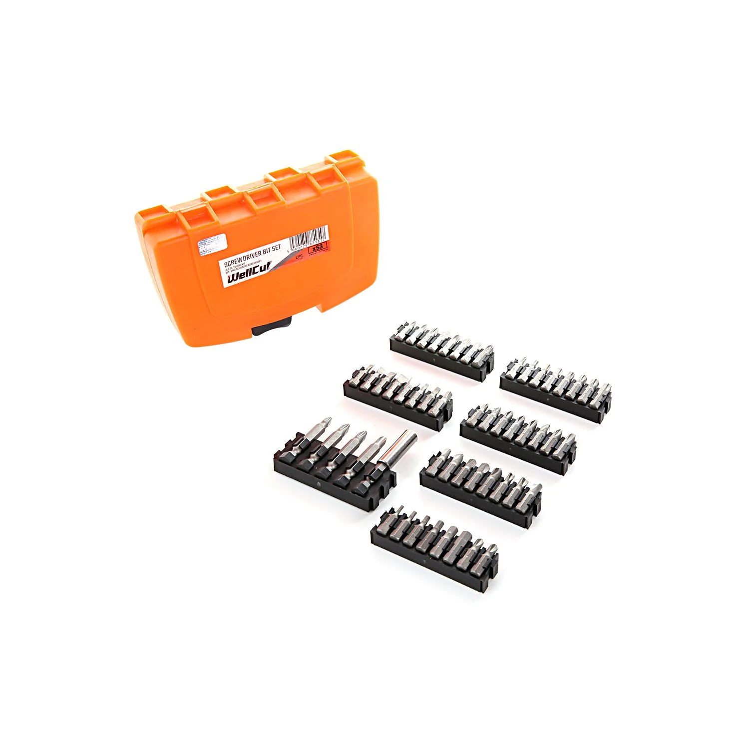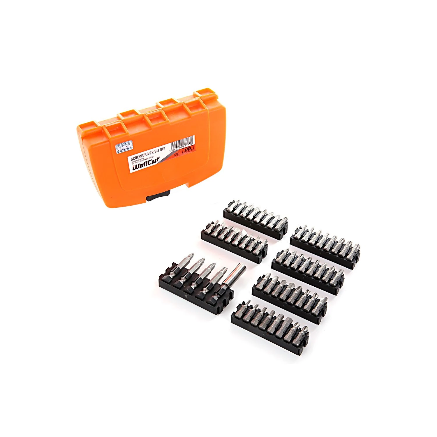 WellCut WC-SDB49 49 Piece Screwdriver Bits Set with Storage Case. 25mm & 50mm screwdriver bits. A handy magnetic bits holder comes useful for interchanging bits between impact drivers. Including phillips, slotted, pozidriv, torx and square bit sizes. Made from chromium-vanadium S2 steel ensuring a solid build. Hardened rating at: HRC 60-62.
