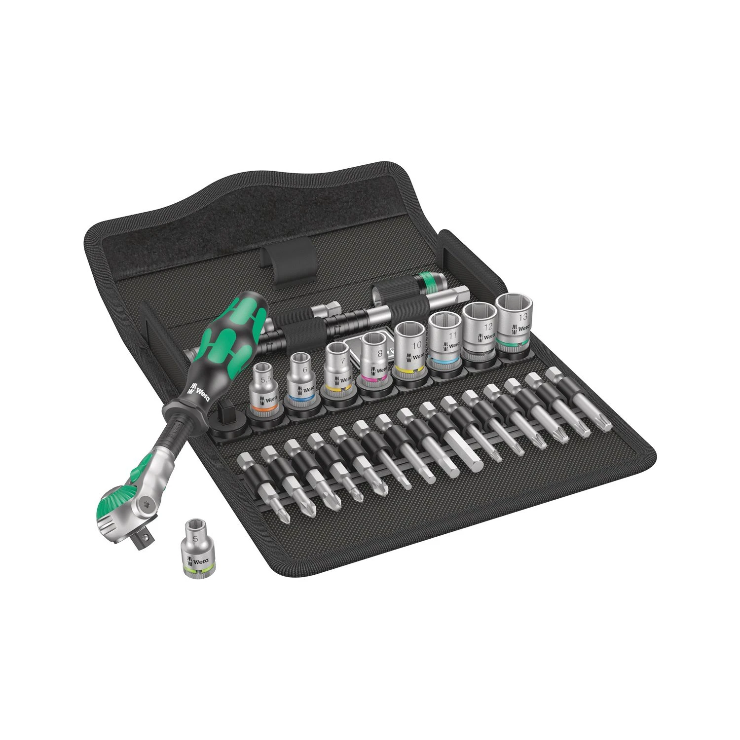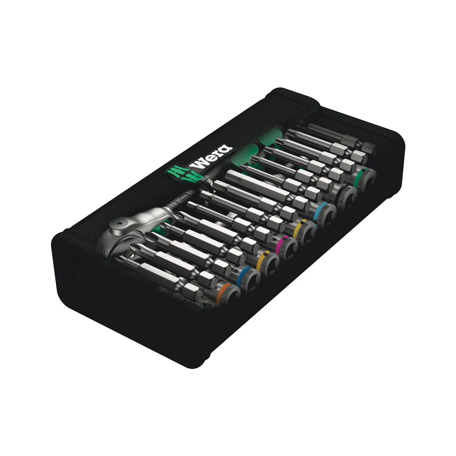 Incredibly compact set arrangement with many tools in a minimum of space. A completely new ratchet set feeling thanks to the unique textile boxes that are very robust and durable. They can be positioned upright for tidy storage on the workshop shelf. Additional surface protection due to textile outer material. Low weight and volume for simpler mobility. “Take it easy” Tool Finder with colour coding according to sizes.