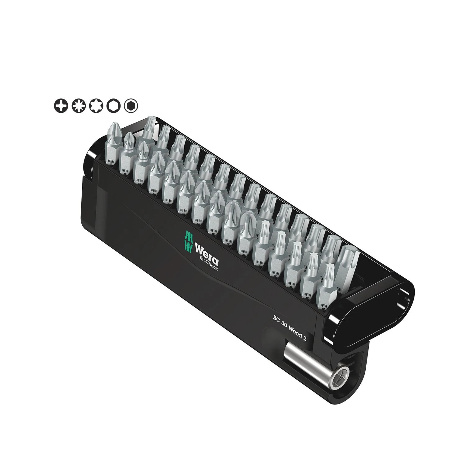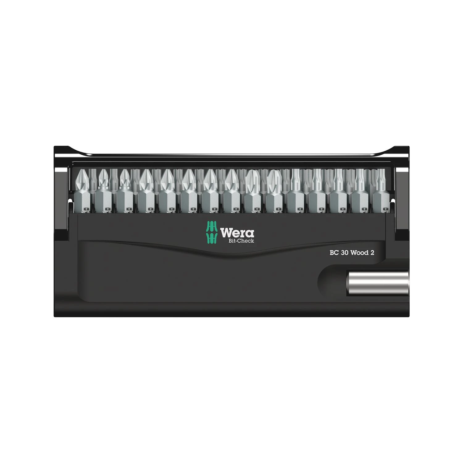 Robust Bit-Check by Wera. Bit-Checks provide a quick overview of the tools available. Bits not needed are simply reinserted into the set and do not get lost. Simple transportation e.g. in the shirt pocket. Includes universal holder with strong permanent magnet for the take-up of bits with ¼” hexagon head drive. Can be inserted in the power screwdriver or for use in the chuck of the electric drill. Multi-component Bit-Check that can be positioned upright for permanently secure bit storage.